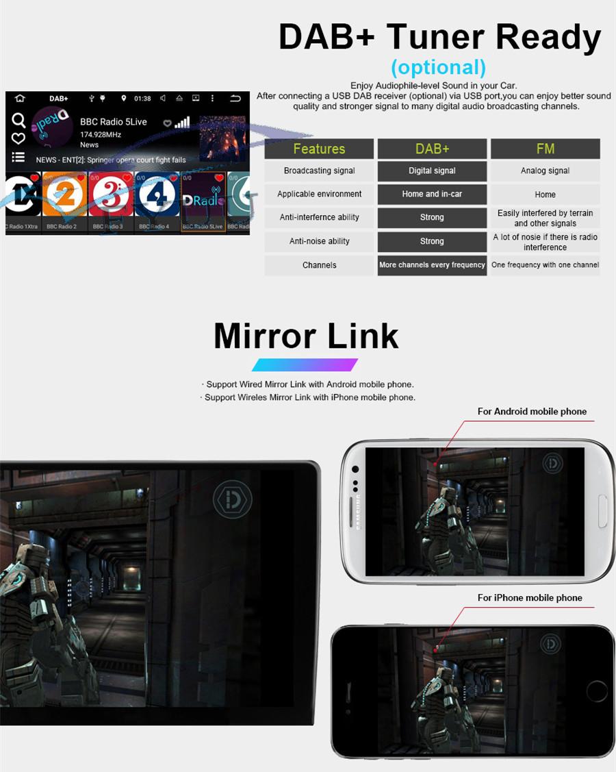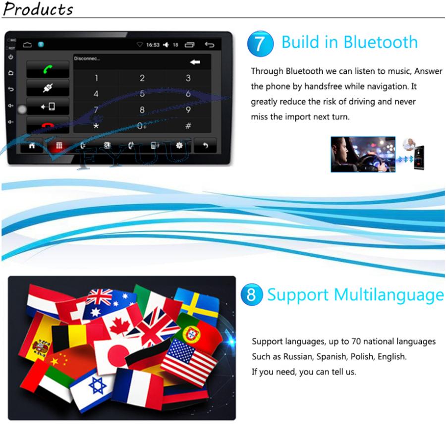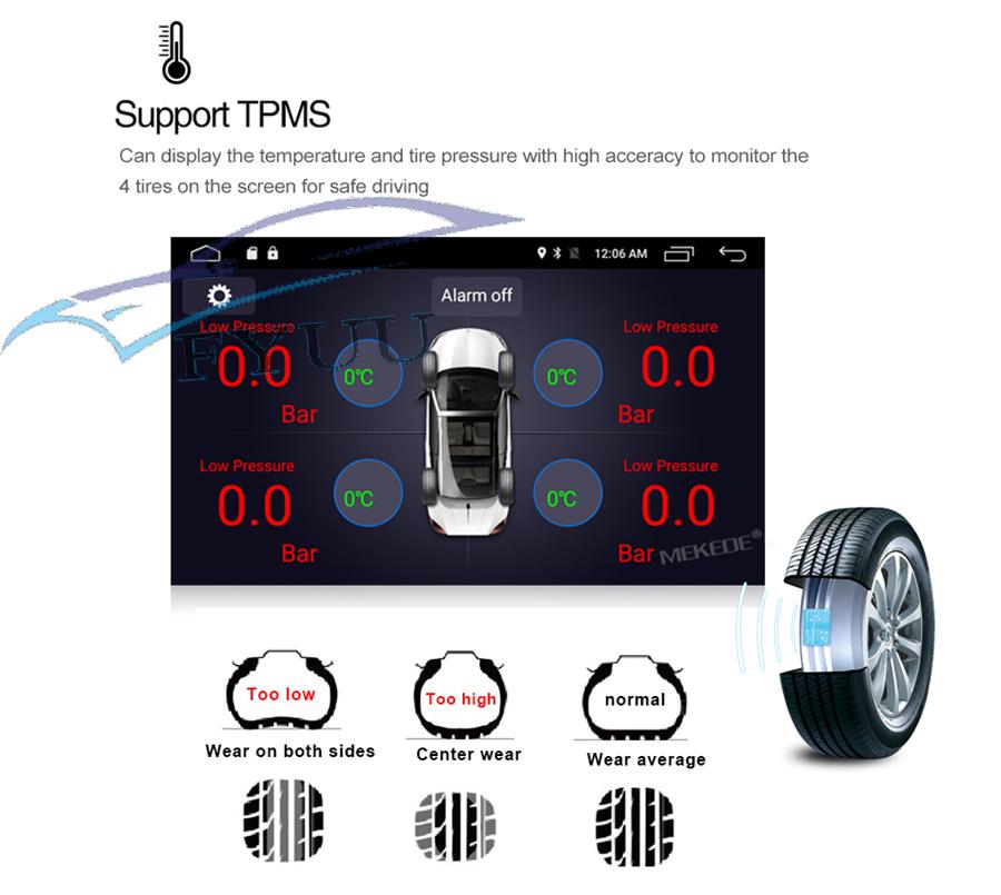 Additional | - Textbook: Could change font, font color, background color, bookmark, reading E-book while listening music - Photo Viewer: Support JPS, BMP, PNG, GIF etc. format. play by revolve, Powerpoint Support 4096*4096 Pixels - Wallpapers: 5 live wallpapers, 17 standard wallpapers, support DIY wallpaper from Gallery - APK Installer: Support Android Package installer - Support Torque Pro(OBD2 &Car): Yes, you can connect a Bluetooth OBD2 Scanner Tool to use this function - Support Mirror Link function: Yes, support screen mirroring from iPhone and android smartphone - Support TPMS: YES (Not Included, you can us to buy it together) |