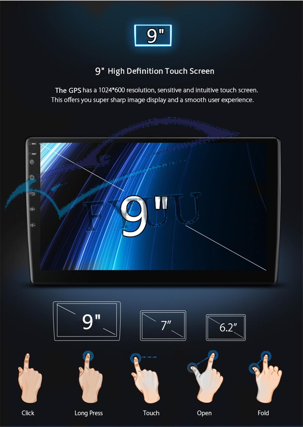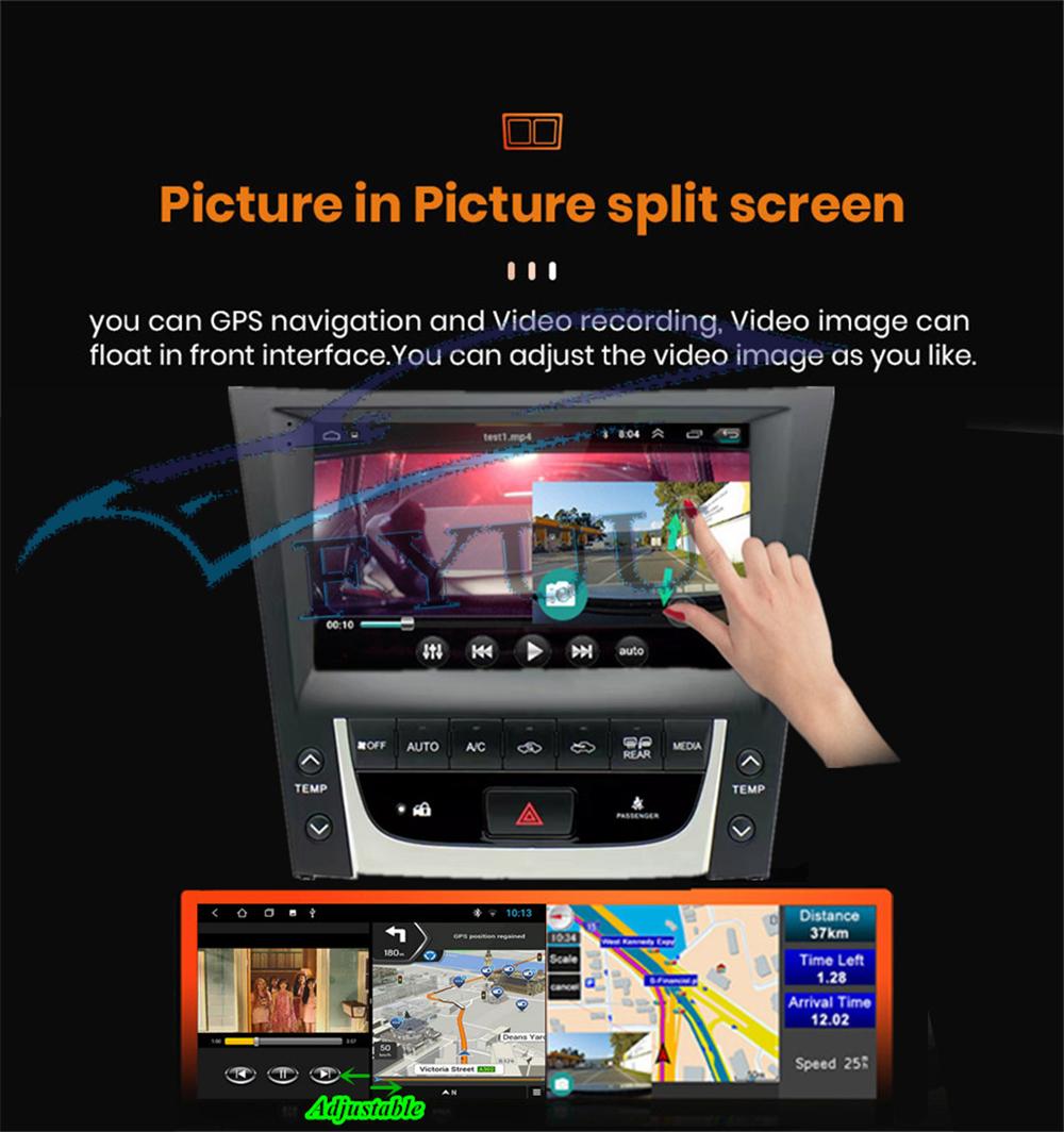 Display | - Touch Screen: Yes - Resolution: 1024*600 - Capacitive or Resistance Screen: Capacitive - Built-in Clock and Calendar: Yes, show real time and can use network-provided time - Main Menu Status Bar display: Can be changed to Music/Radio/BT-Stereo Player and Clock/Date/Week - Change Apps-Icon Position: Yes - Picture in picture split screen:Yes Split screen feature enables you to use two applications at the same time. For example running Navigation with Music Player or Radio with Navigation at the same time. Optimum convenience for both the driver and passengers. |