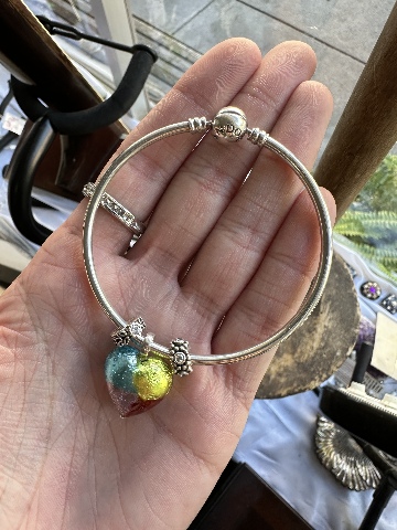 Item here is a Pandora sterling silver charm bracelet with a heart charm and two little charms with clear quartz. Bracelet is signed Pandora and marked sterling. Bracelet closes with the ball fold clasp. Cute charms to get you started on your collection!