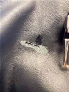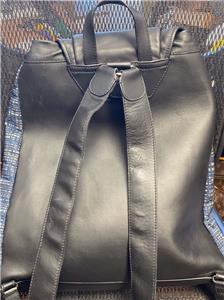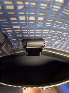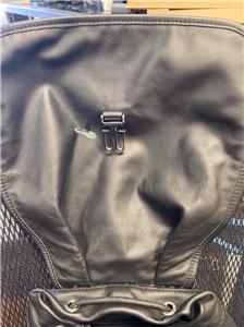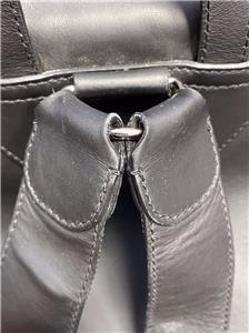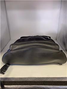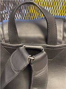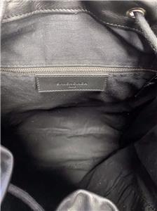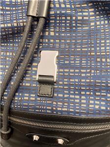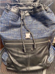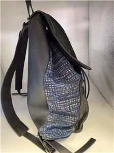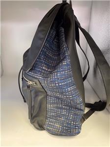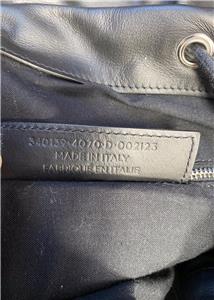 Authentic Balenciaga Leather & Nylon Traveler Drawstring Backpack. Black leather with Blue, Black & Gray Nylon. Silver-tone hardware. Used in good clean condition with some wear. Scuffs in leather, light scratches. The inside of the flap has a little damage as shown in photos. It looks like that portion of leather has been peeled off. Measures approx 16.5" x 15"H. Inside there are 2 slip pockets and 1 zippered pocket. Clean inside, no odors. No dust bag included.