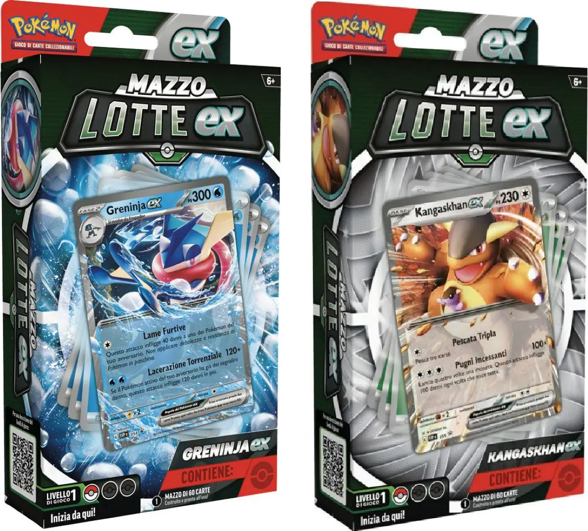 Mazzi Singoli. Non è possibile scegliere il soggetto, l’articolo verrà selezionato casualmente in base alla disponibilità al momento dell’evasione. Due potenti Pokémon-ex sono pronti a scendere in campo e scatenare la loro forza nei nuovi Mazzi Lotte ex del GCC Pokémon. Scegli la furia materna di Kangaskhan o il talento furtivo di Greninja: in ogni caso avrai un potente Pokémon-ex al tuo fianco. Ogni set contiene un mazzo da 60 carte con protagonista un eccezionale Pokémon-ex e include tutto quello che ti serve per giocare fin da subito. Che la lotta abbia inizio! In ciascun Mazzo Lotte ex del GCC Pokémon troverai: 1 mazzo di 60 carte pronto all’uso 3 schede di riferimento 1 libretto delle regole 1 tabellone di gioco per un singolo giocatore 1 set di segnalini danno 1 moneta extra-large 1 portamazzo 1 scheda strategica 1 carta codice per giocare con questo mazzo online Edizione in italiano |