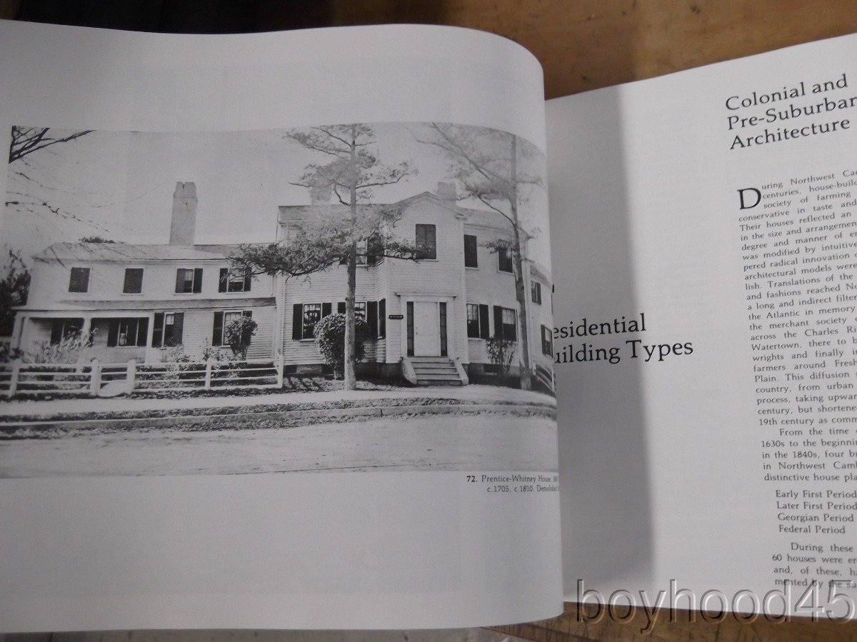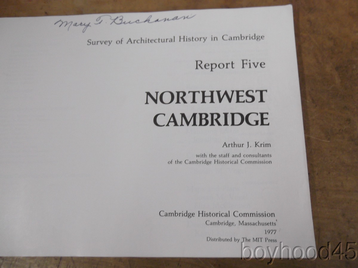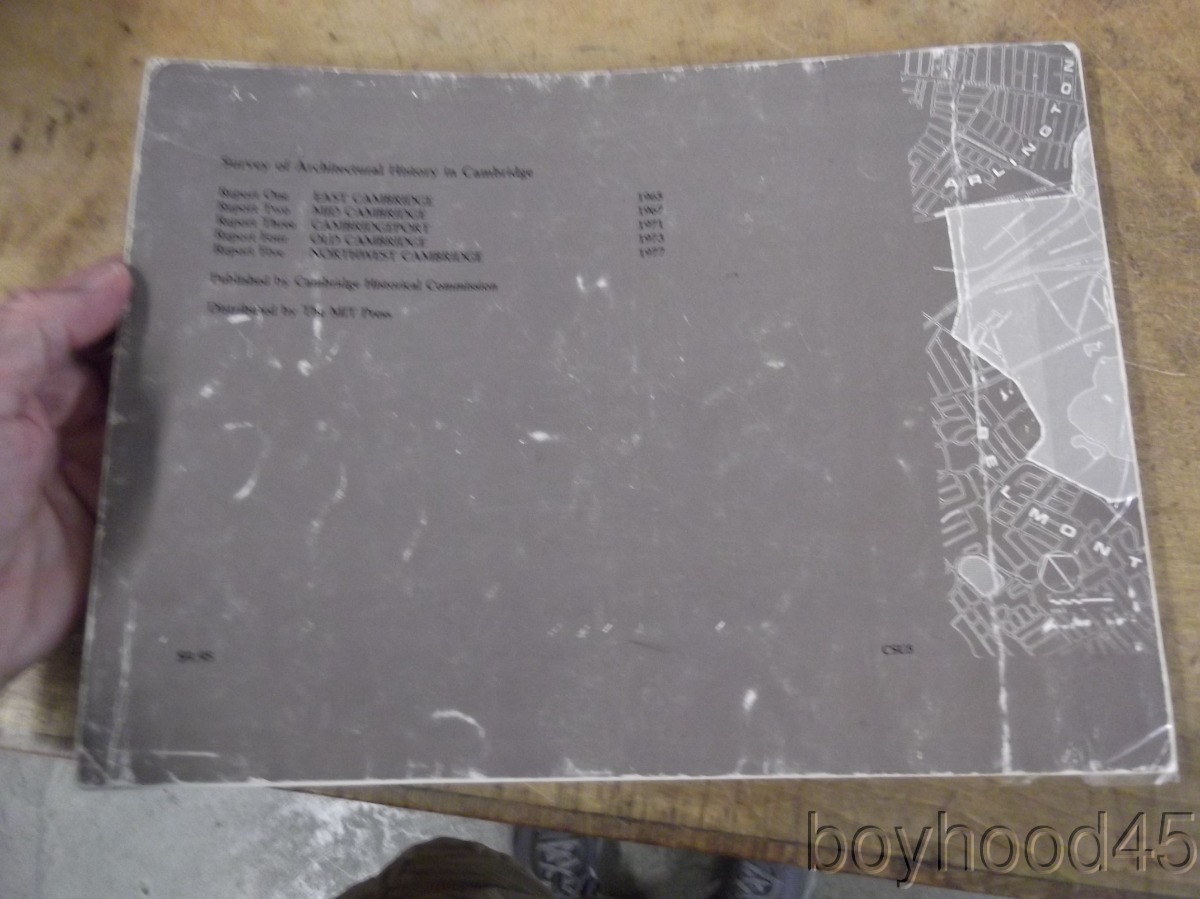 I am offering "Northwest Cambridge & Survey Index." This is Report 5 of the 'Survey of Architectural History in Cambridge' published by the Cambridge Historical Commission/The MIT Press, Cambridge, Massachusetts, 1977. Softcover book that shows wear--spine is taped, creasing and scuffing to covers. Internally clean, sound. I will call the book Good. Measures 12 X 9, 206 pages. A SCARCE FEW copies of this book can be found on Amazon and other internet booksites for upwards of $353!!!!!!!!!!!!!!!!! I will offer this slightly-worn, but sound copy for only $60.00 plus $5.50 S&H in the US. Shipping costs to Canada will be considerably less than the general international rate quoted. (Rm 1, L, Case 2)