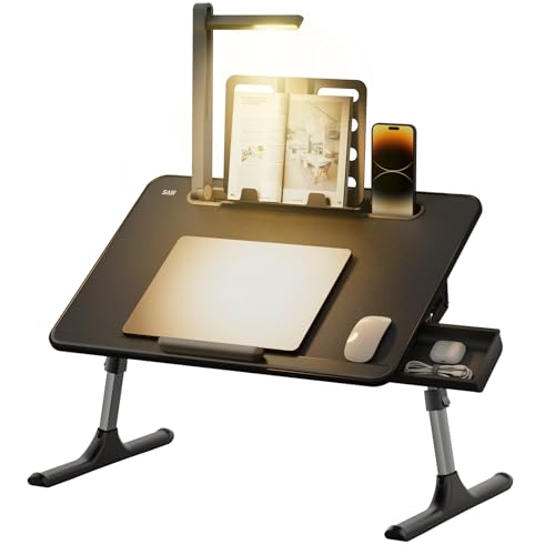 Escritorio multifuncional para computadora portátil: está equipado con patas tipo trineo que son fáciles de deslizar, un escritorio grande con dimensiones de 23,6 x 15,7 x 0,39 pulgadas, lámpara LED desmontable, cajones de almacenamiento, estantería desmontable, tope móvil para computadora portátil, ranuras para tabletas y cable de carga USB para Satisfaga todas sus necesidades para el trabajo de oficina en casa.