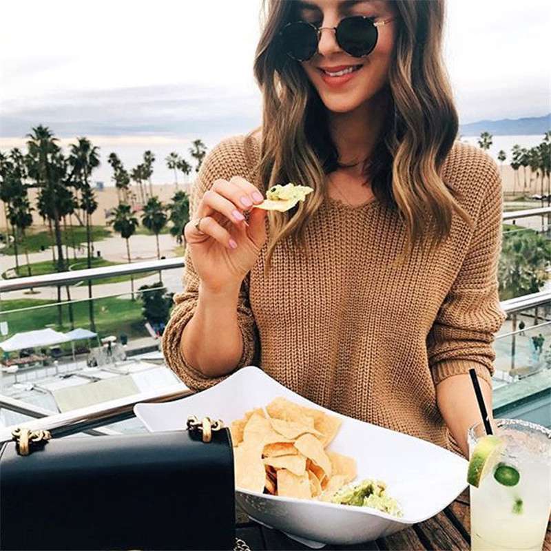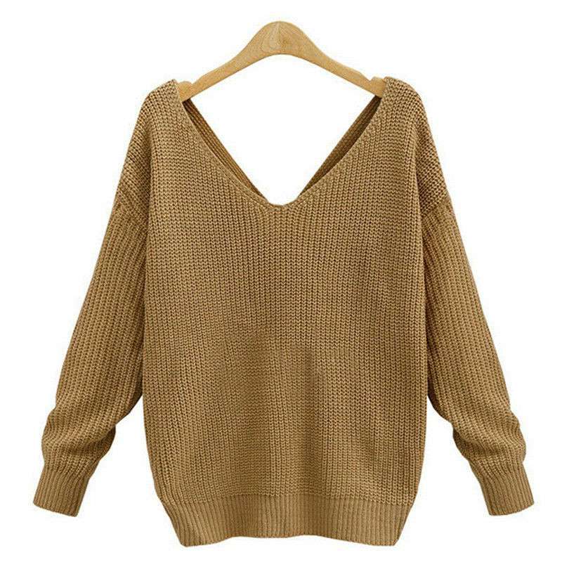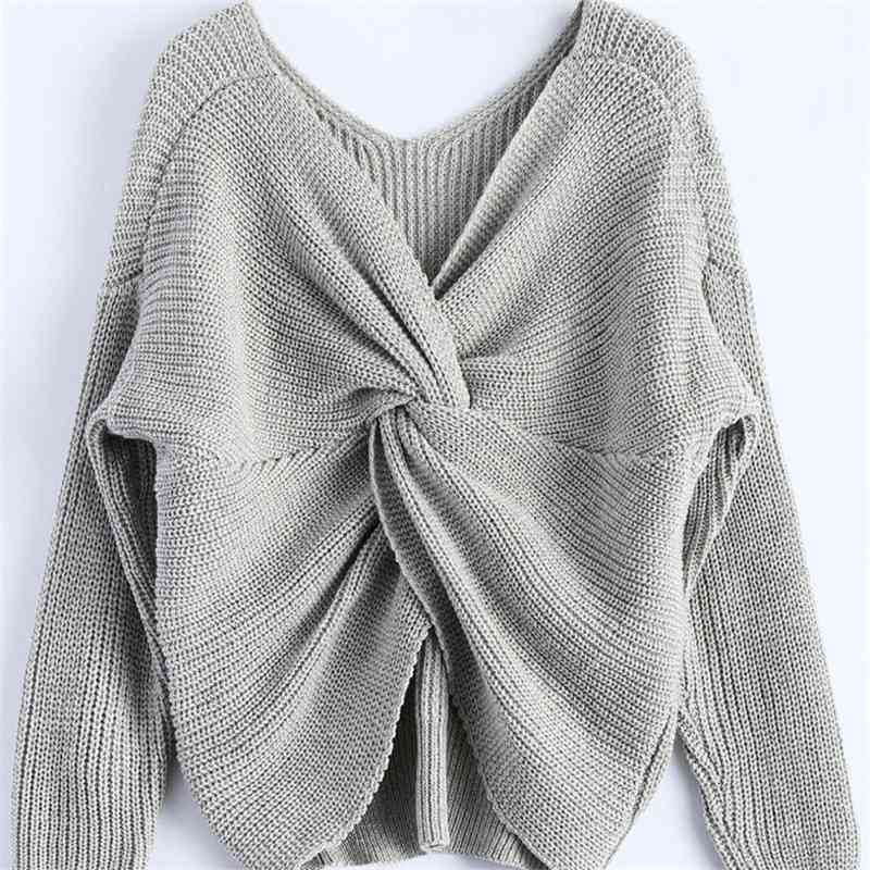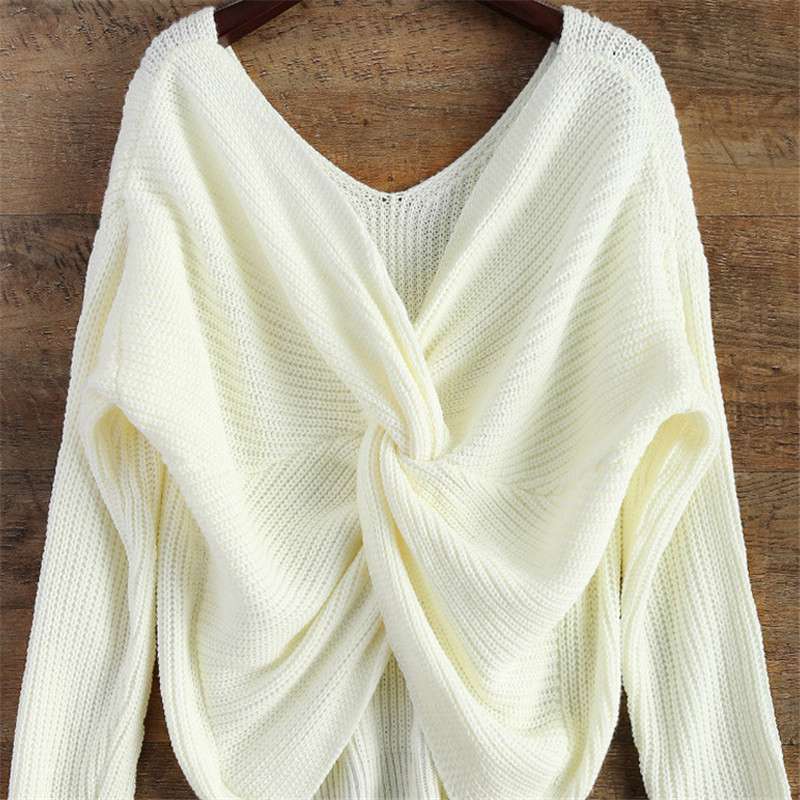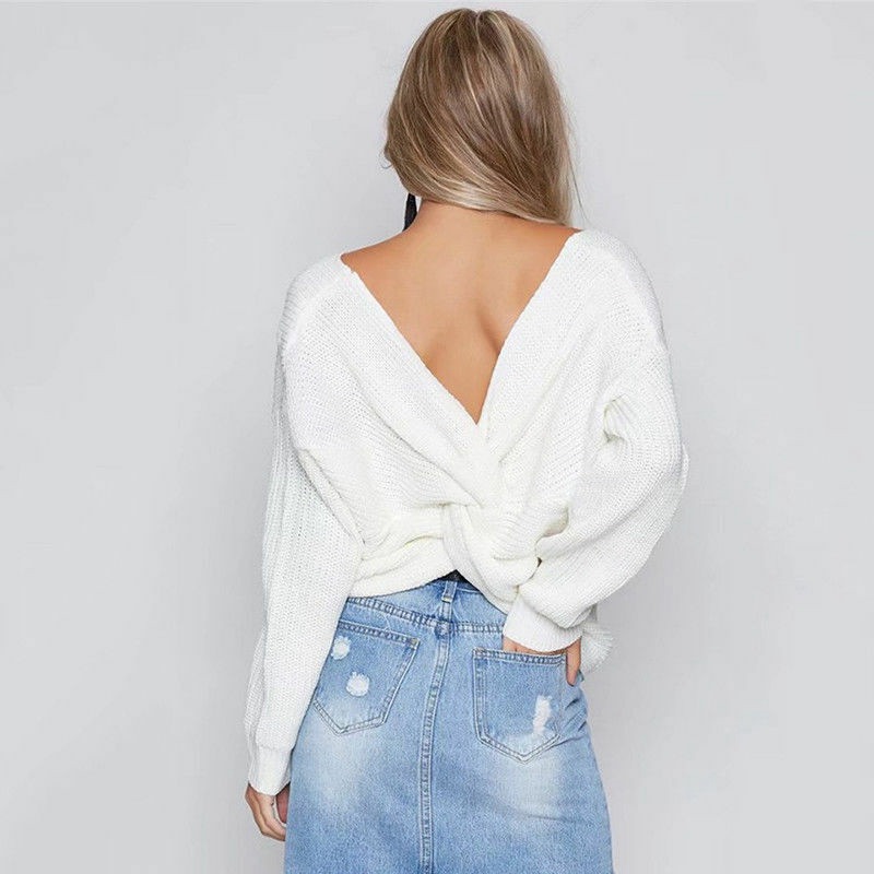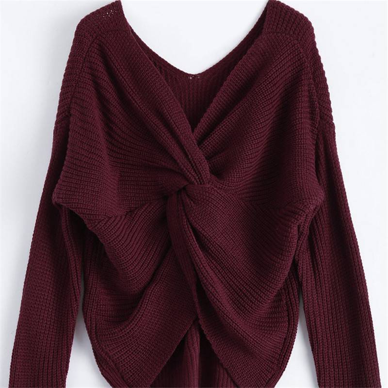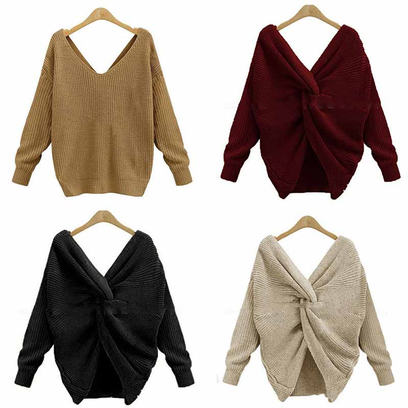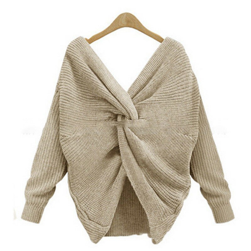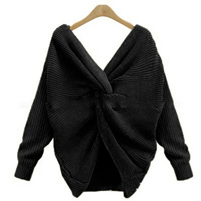 Womens Knitted Sweater Jumper Long Sleeve Knot Twist Wrap Cross Back V Neck