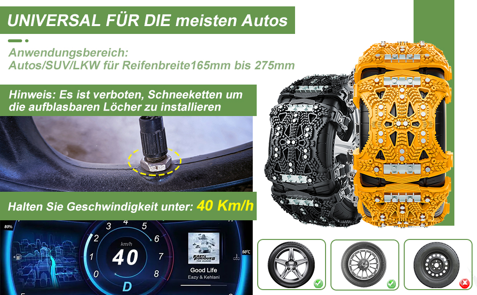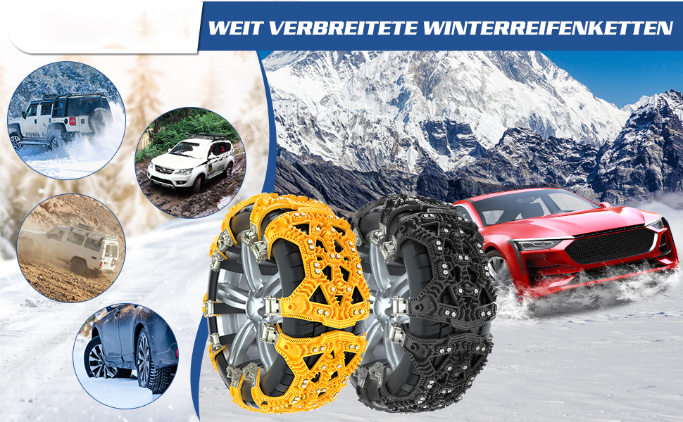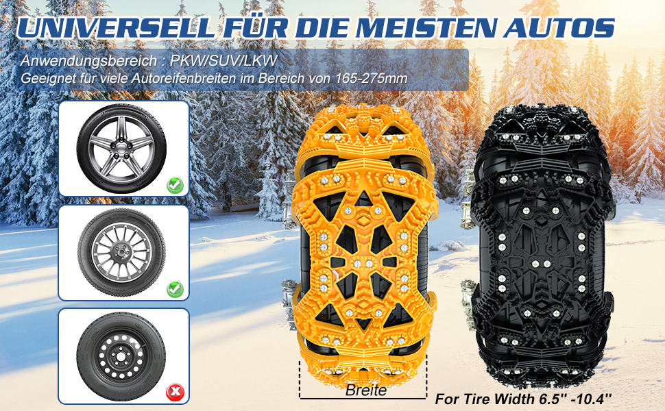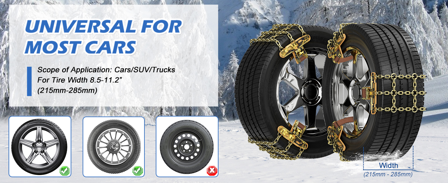 ❄️【Adjustable Size】:Our tire chains are adjustable, it can be effortlessly fitted to most standard sizes of alloys or steel wheels on cars, vans & RV's whose car tires width from 215mm-285mm, suitable for most car tires.