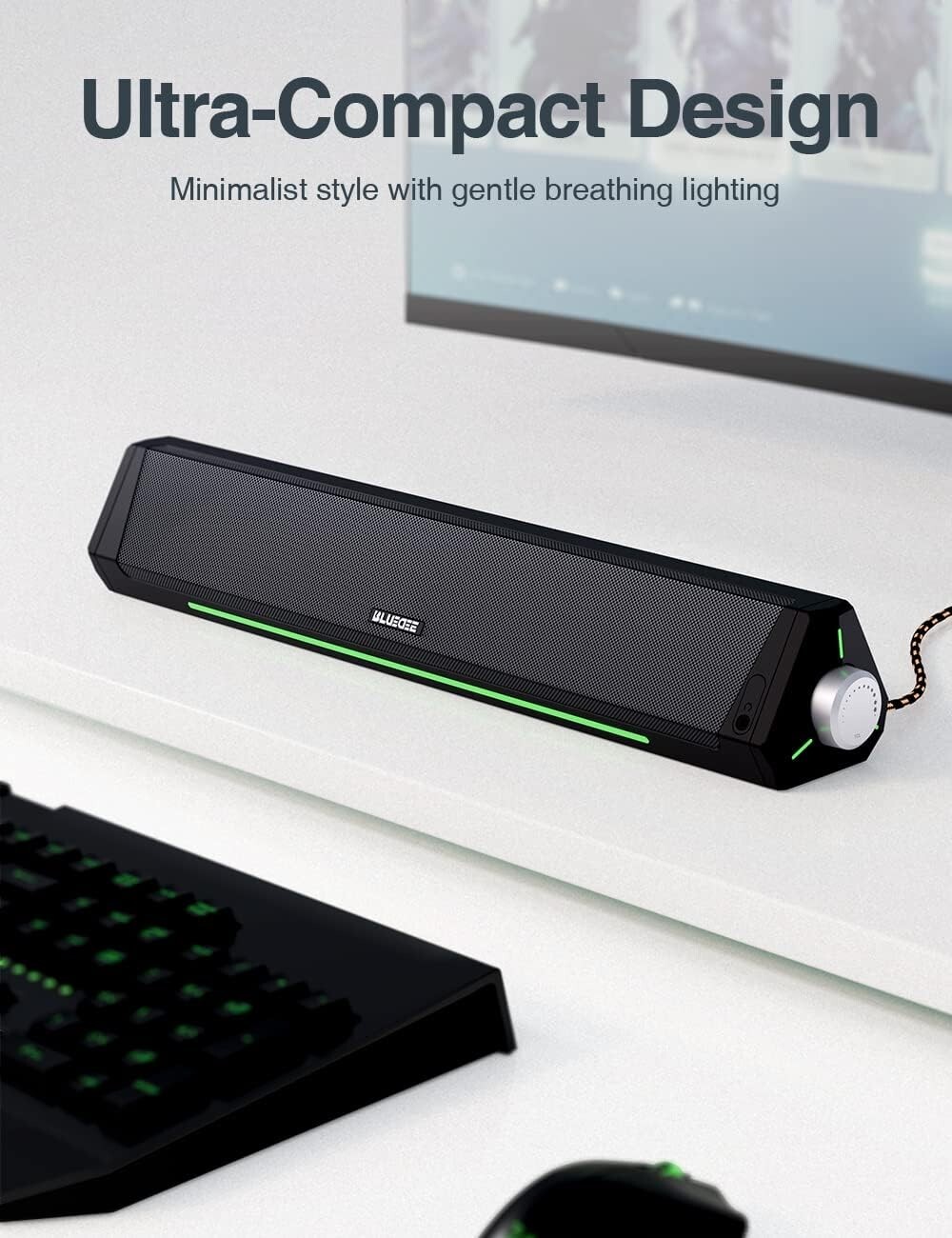 We also prioritize organization and sustainability. The durable nylon-braided Y-cable combines both power and audio, keeping your workspace tidy. Made from eco-friendly ABS material, our soundbar and packaging contribute to protecting our planet.