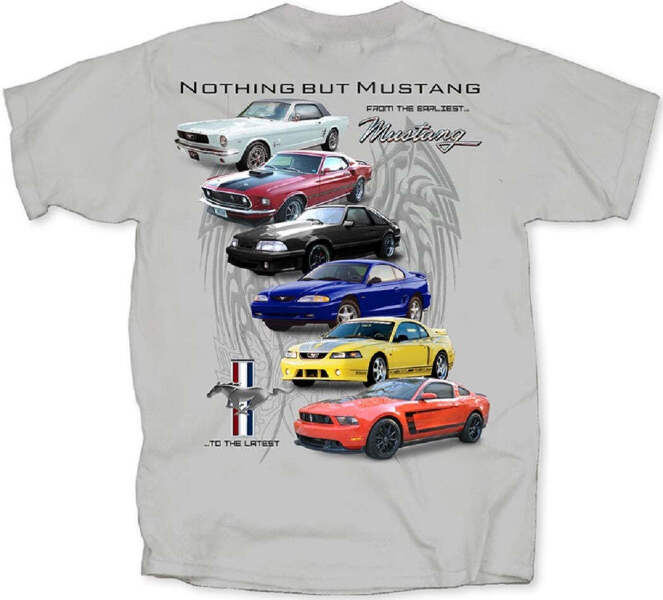Ford Nothing But Mustangs Mens T Shirt is a Heavyweight 100% Cotton T shirt with a Silk Screened Design. This shirt features several different generations of Mustangs printed on the back and a Mustang logo printed on the front. It is preshrunk and machine washable. It is perfect for any Mustang enthusiast. It is available in a regular fit and comes in a gray color.