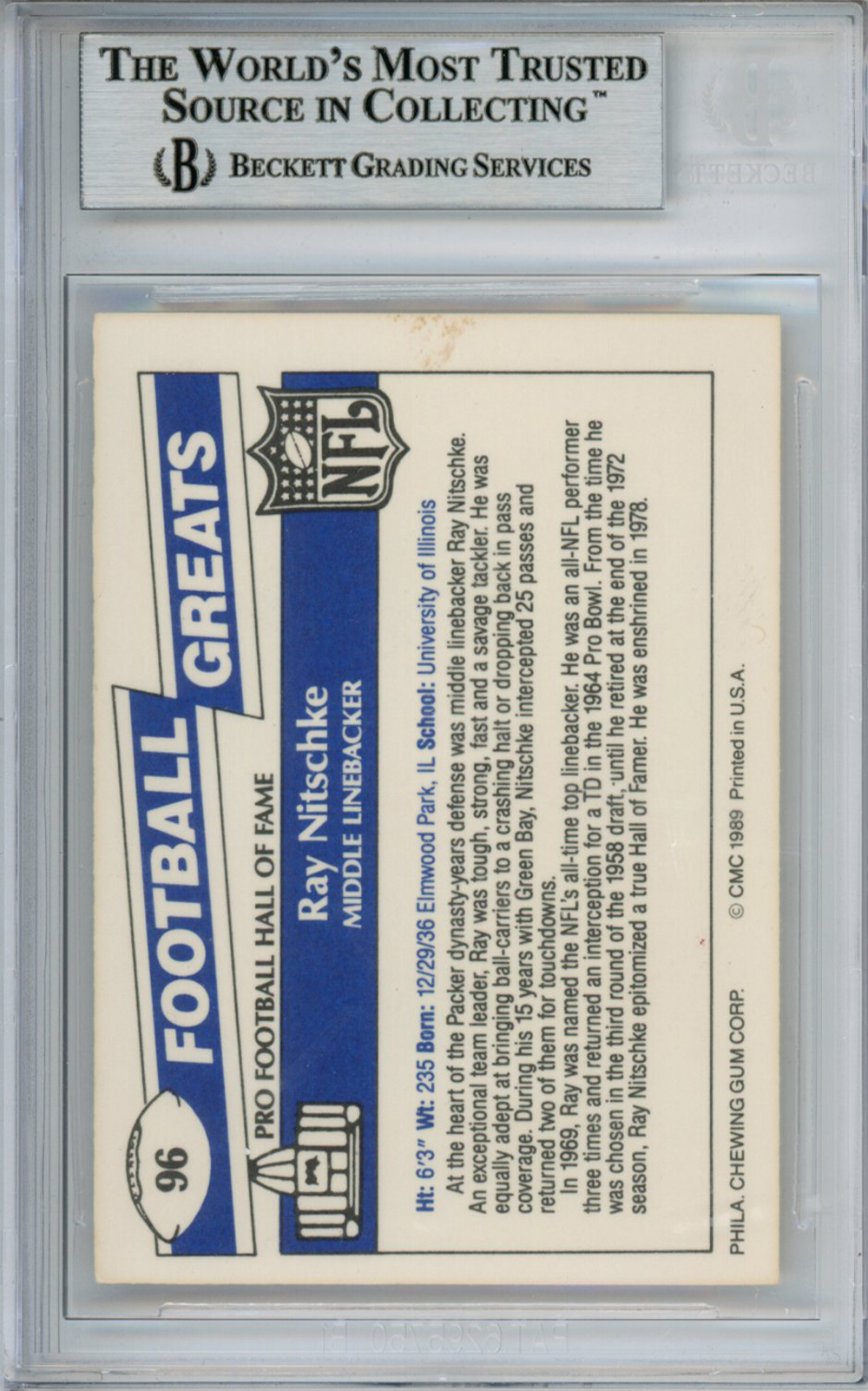 The number in the listing title is just an inventory sku for our records and is not the authentication number. The item pictured is a stock photo unless otherwise noted. This is a trading card that was personally autographed by Ray Nitschke. This has been professionally slabbed by Beckett Authentication Services (BAS) and includes a certificate of authenticity from Denver Autographs.