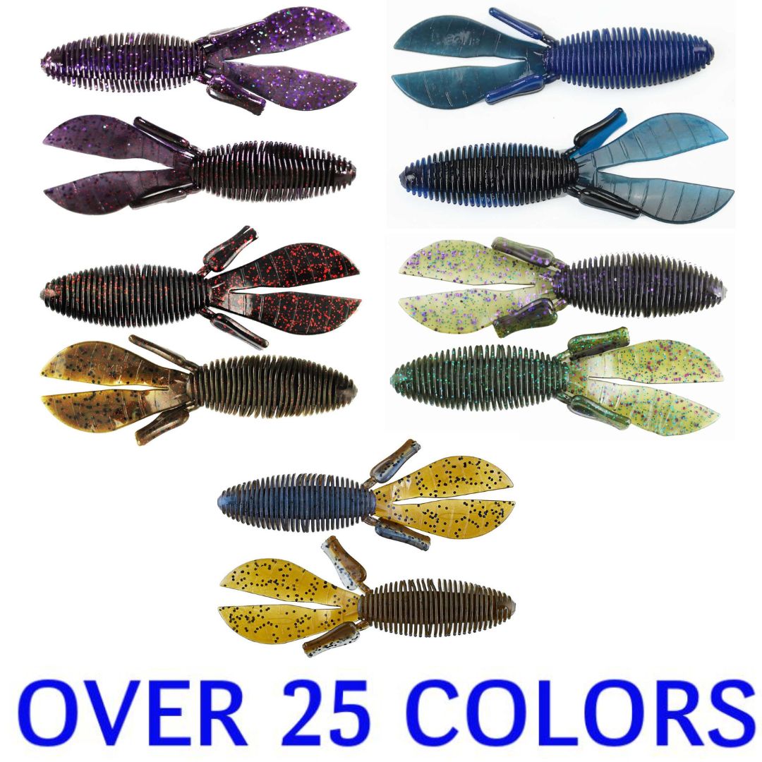 Pitching and flipping has a new go-to bait. The D Bomb is a bulky 4.5" creature bait with a unique ribbed body that displaces lots of water resulting in a straight fall. The tails sail when left connected or flap wildly when separated. The body is thinner where the hook comes out for easy hook sets but has a thicker head so the bait stays on the hook.