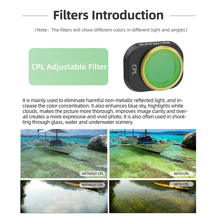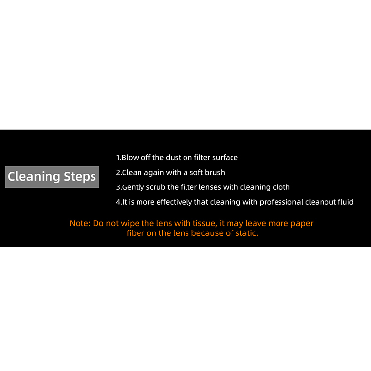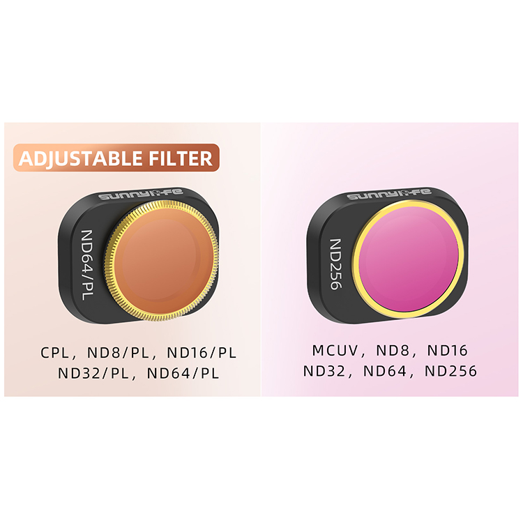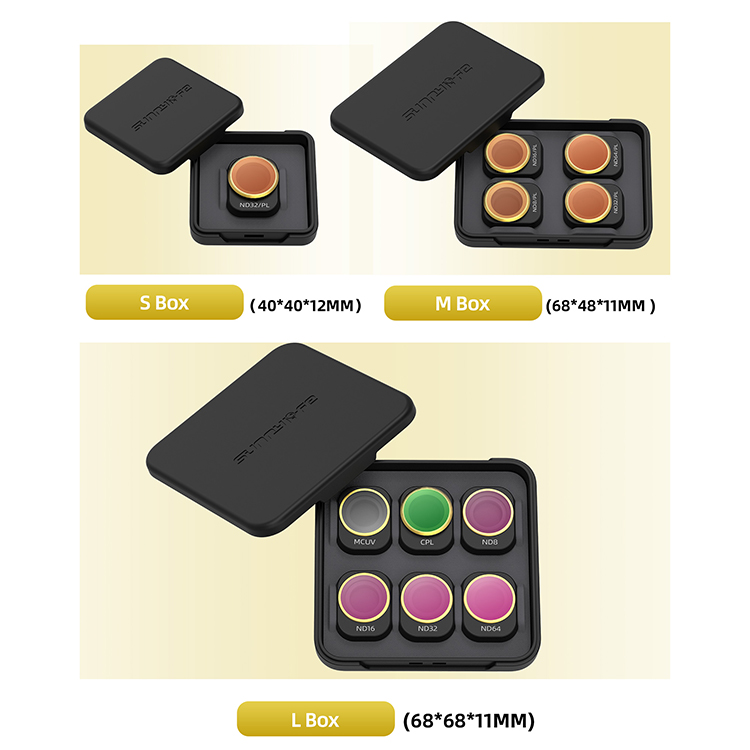 l Types (Optional): MCUV, Single ND8、ND16、ND32、ND64、ND256 (Adjustable), Single ND8/PL、ND16/PL、ND32/PL、ND64/PL (Adjustable), CPL, CPL + ND8 + ND16, ND16 + ND64 + ND256, ND8 + ND16 + ND32 + ND64, ND8/PL + ND16/PL + ND32/PL + ND64/PL, MCUV + CPL + ND32 + ND64, MCUV + CPL + ND8 + ND16 + ND32 + ND64