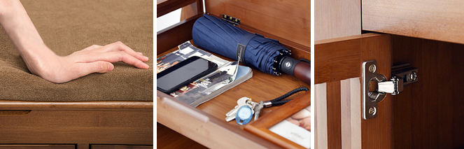 -Hidden side drawers, hidden space under the cushion. Provides extra space to store keys, wallet, socks and other small items.