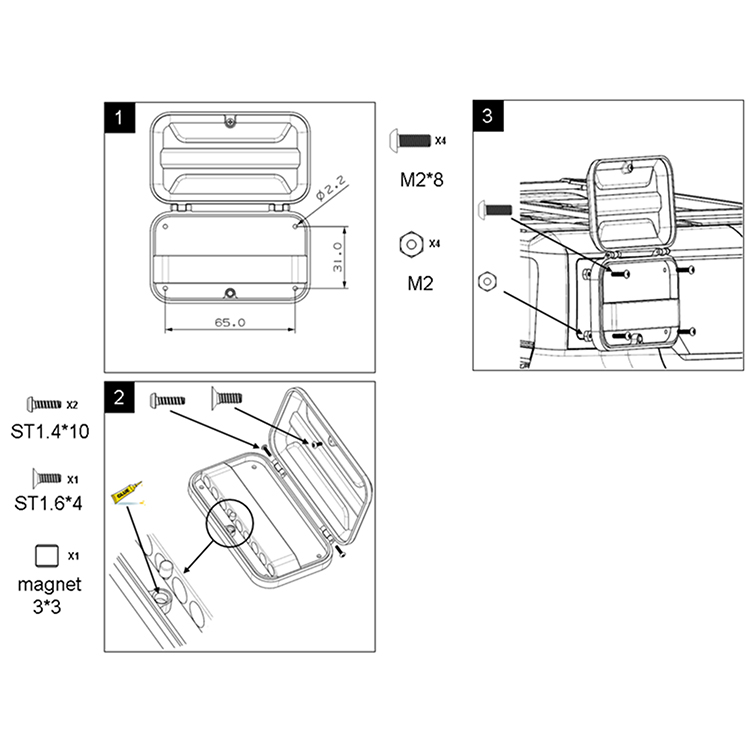 l Open holes in the car shell for installation, as shown in the figure, the diameter of the hole is 2mm, and the number of holes is 4