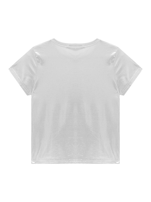 Women Shiny Metallic Short Sleeve T-shirt Round Neck Glossy Solid Color Tops for Dance Party Rave Festival.