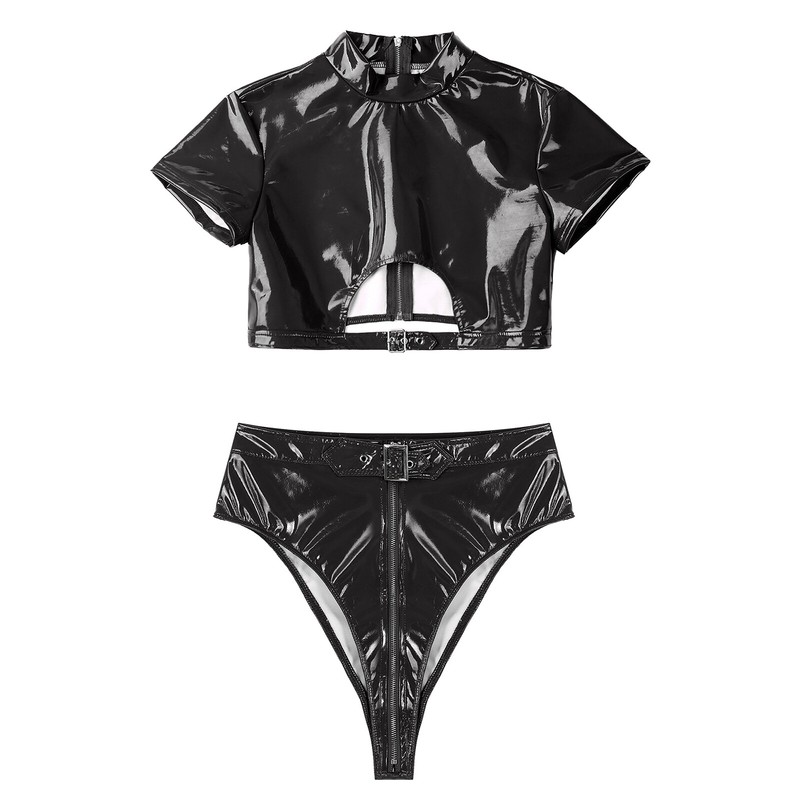 Crop top designs with stand collar, short sleeve, back zipper closure and slim fitting; matches with high cut underwear, zipper crotch for opening easily.