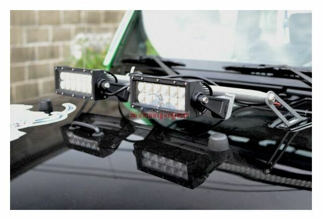 This hood hinge light bar was designed with form and function in mind. The center bar rotates 360 degrees to give you limitless options for mounting angles. The support brackets were also designed to clear the windshield washer squirters on all year JK's and JKU's. Simply remove the hood hinge bolts, install the riser brackets with the factory hardware then install the center bar. This kit comes with two 36 watt LED lights. Each LED light measures approximately 8" and contains 12 bulbs. The lights come with at least 12" of wiring but you will have to provide your own switches, relays and fuses.