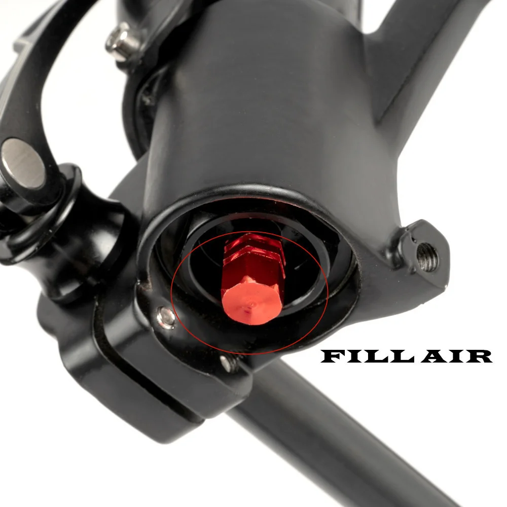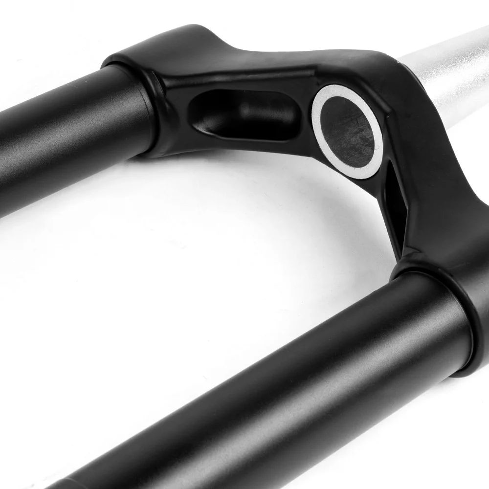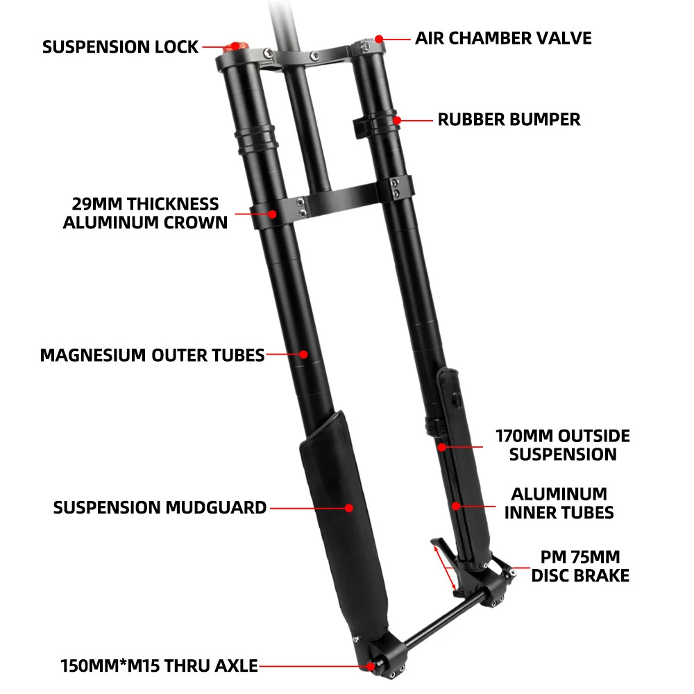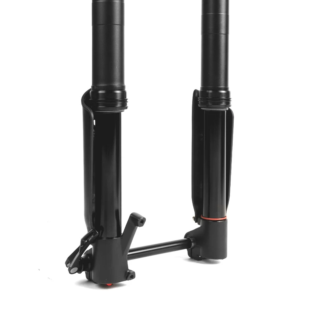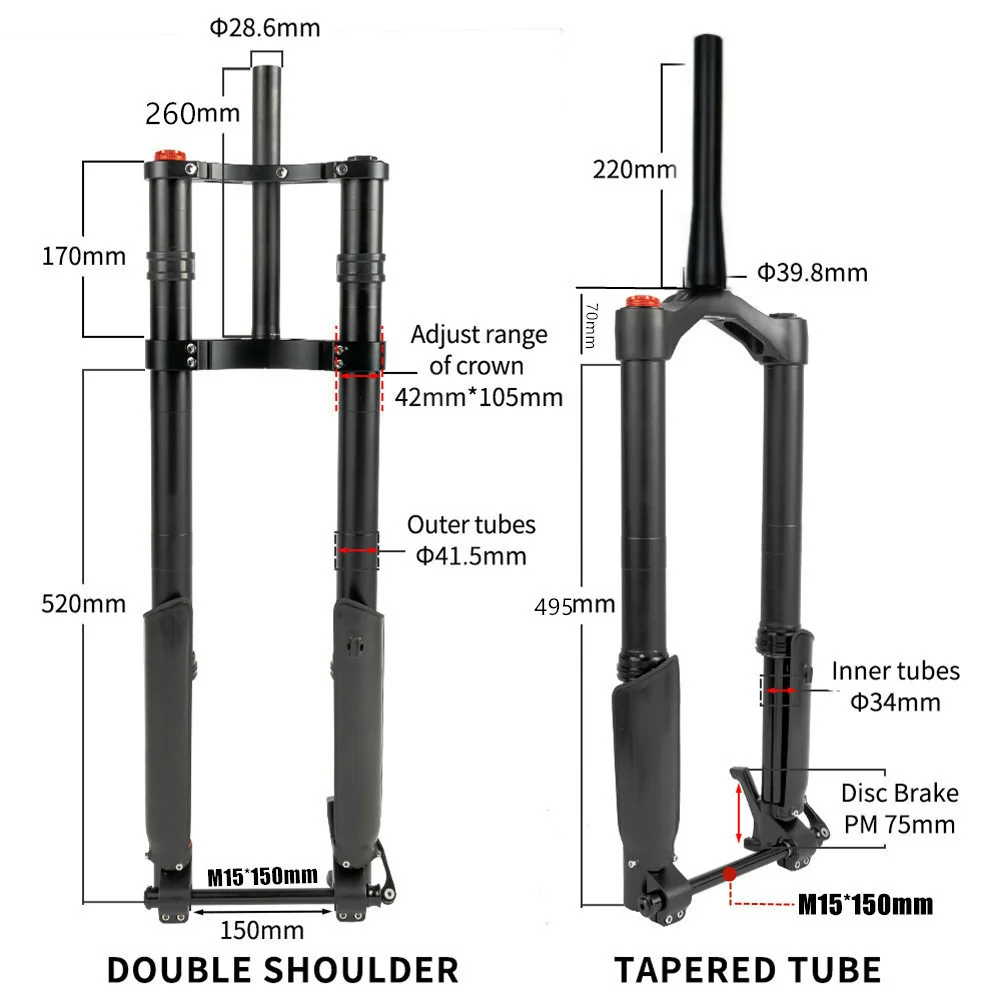 Weight: 3.8/2.9KG Dimensions: 26 Travel: 100-120mm Available Down tube:15 mm Axle/150 mm Adjustments: Preload / Rebound / Adjust High Pressure Stanchion: 35 mm (1.38 inch ) AL-7075 Brake type: Disc brakes ( Post mount) Features:Single air spring/Inverted fork/Straight Steerer Tube