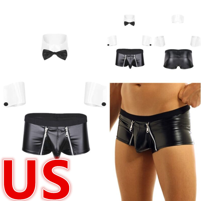Mens Drawstring Low Waist Zipper Briefs Wet Look Patent Leather Underpants Underwear.