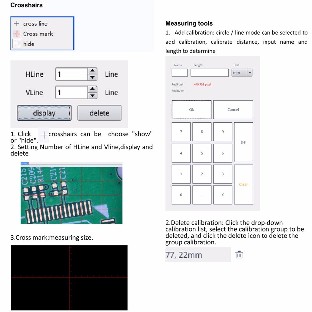 - Geometric measurement : Line length, radius fixed circle, two point fixed circle, three point fixed circle, concentric circles The geometric area: Polygon, square