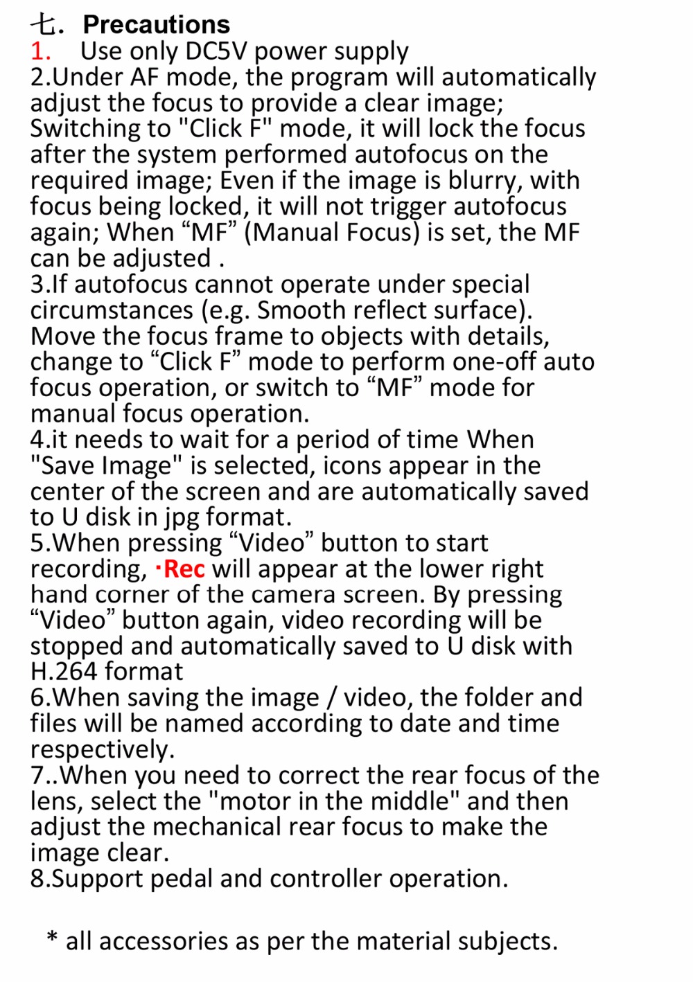 1.Before connecting power supply, please connect mouse to the camera. 2.it needs to wait for a period of time When "Save Image" is selected, icons appear in the center of the screen and are automatically saved to U disk in jpg format. 3.When pressing “Video” button to start recording, •Rec will appear at the lower right hand corner of the camera screen. By pressing “Video” button again, video recording will be stopped and automatically saved to TF card with H.264 format 4.When saving the image / video, the folder and files will be named according to date and time respectively. 5.When you need to correct the rear focus of the lens, select the "motor in the middle" and then adjust the mechanical rear focus to make the image clear.