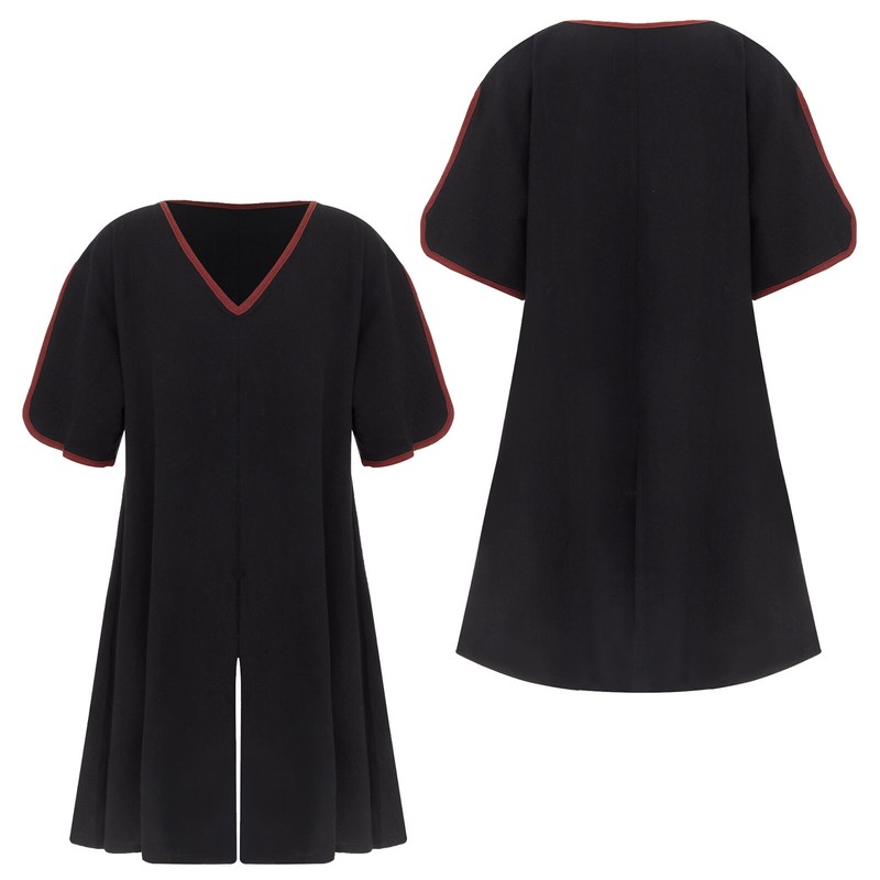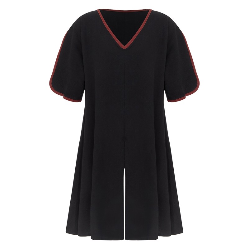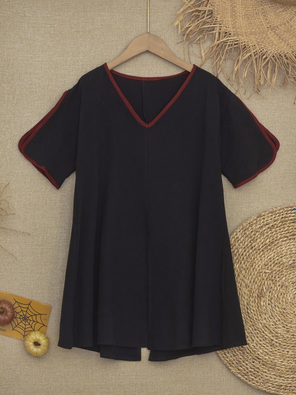 Designed v neck, short sleeve, split at sleeves, front and back bottom, is very loose to fit.