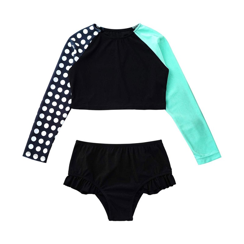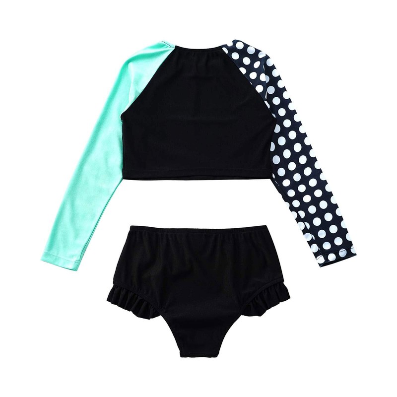 Kids Girls Long Sleeve Asymmetric Polka Dots Print Crop Tops Ruffle Trim Shorts Swimwear.
