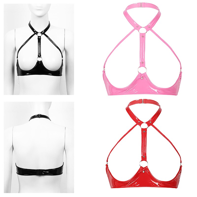 Women’s wet look patent leather bra top lingerie, wire-free and unlined design.