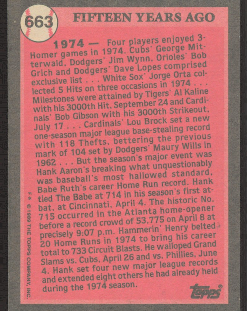 1989 Topps Turn Back the Clock Hank Aaron #663