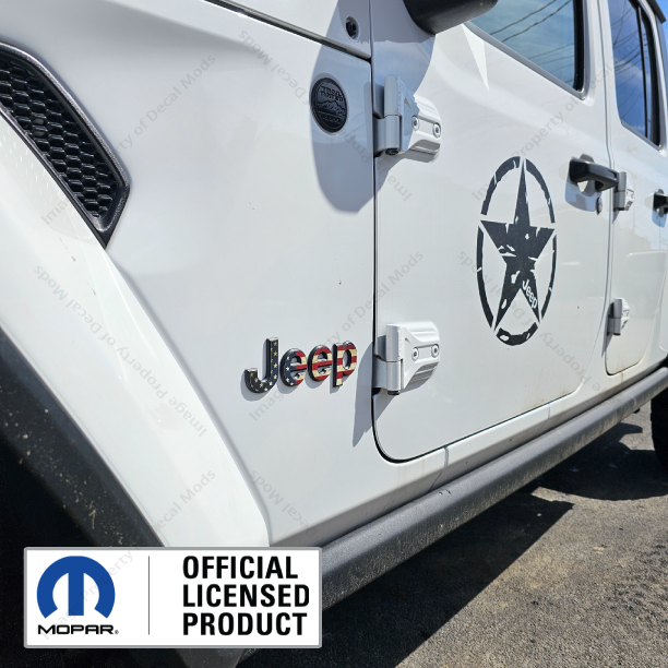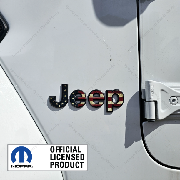 This set includes the following: - Set of JL Wrangler Side Fender Overlay Letters for Both Sides (Part number: FJ9M3 ) - Decals are in the color: Distressed USA American Flag - Installation Instructions |