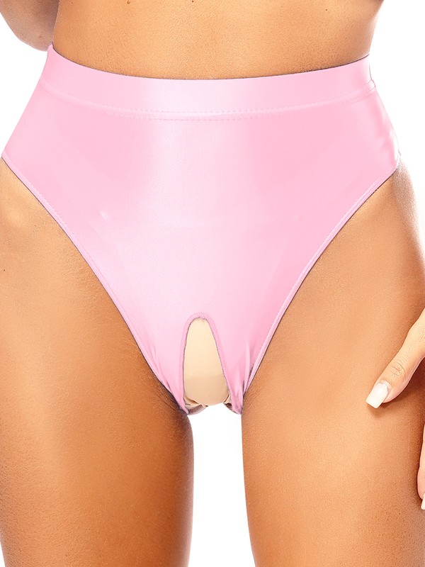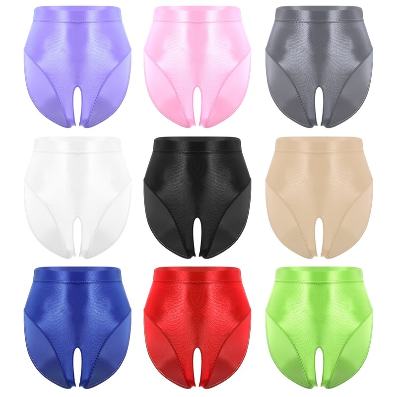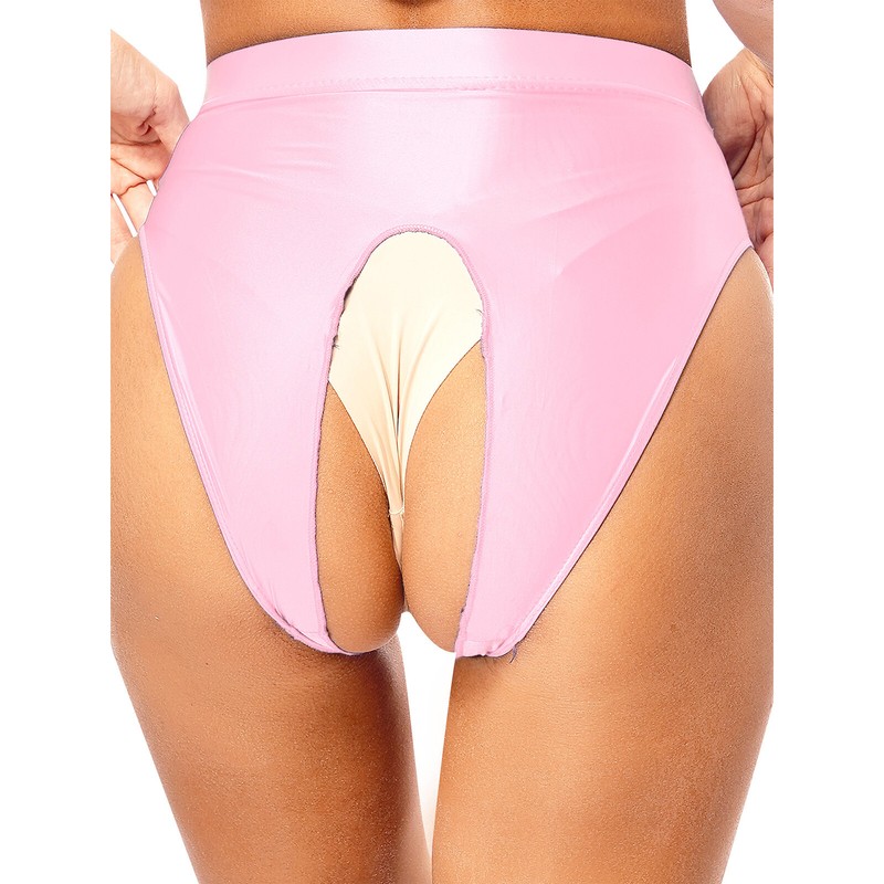 Womens Glossy High Cut Brief Full Coverage Crotchless Underwear Elastic Panties