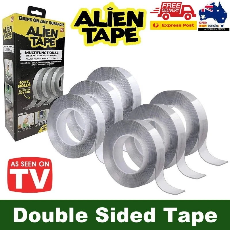 Alien Tape is a revolutionary transparent and double sided new tape that doesn't use adhesive but is strong enough to hold an incredible 7.94kg (17.5 lbs.) on any surface! Alien Tape is the incredible new advanced-grip technology tape that instantly locks anything into place without screws or anchors! It's also reusable just remove, rinse and reuse! Use it again and it's just as strong!