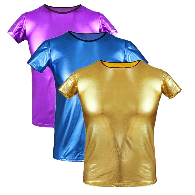 Short sleeves and round neck, men’s T-shirt design with three press buttons at crotch, solid color.