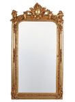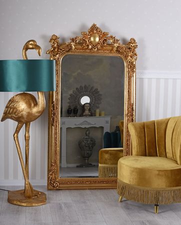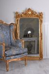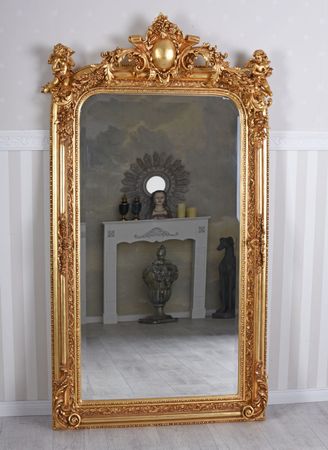 IL Trumeau Mirror "Château" È un camino impressionante e uno specchio in piedi in un sontuoso stile rococo, che, con le sue magnifiche dorature, delicate figure amorial, trasforma ogni stanza in un capolavoro barocco come decorazioni di stucco armonico e artistico. Realizzato in solido Legno e stucco E raffinato in patina elaborata a mano, la cornice si comporta come un autentico antico del 18 ° Secolo.