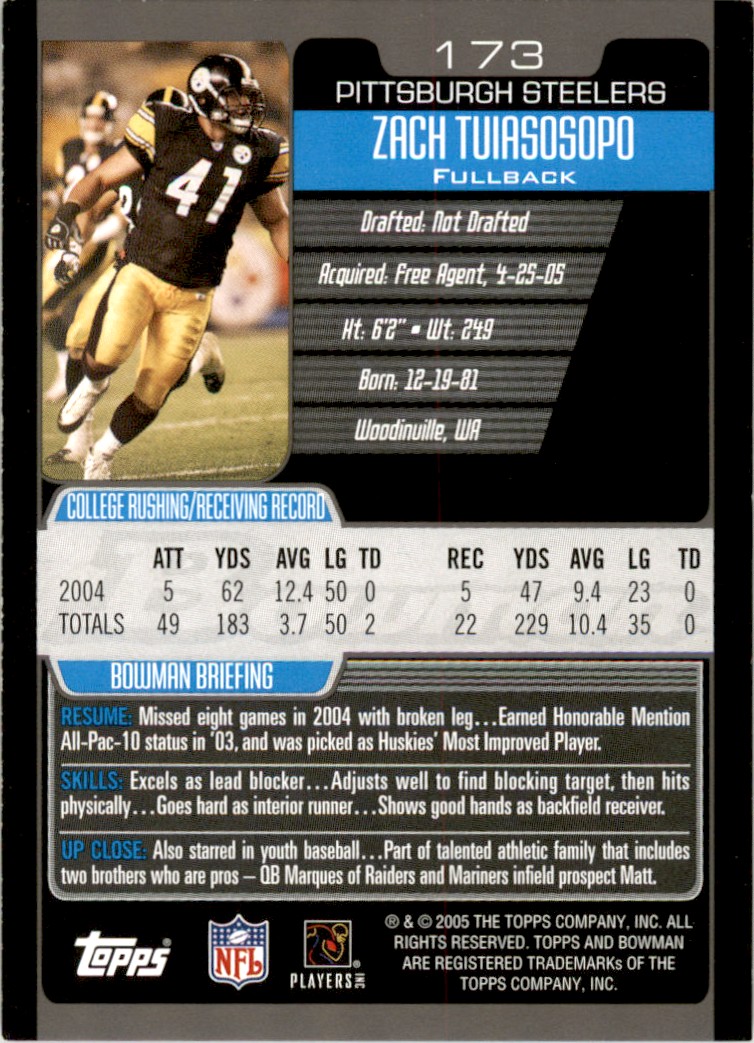 2005 Bowman Zach Tuiasosopo Rookie Pittsburgh Steelers #173