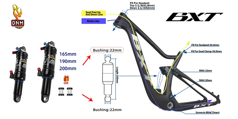 The length of the shock absorber is selected. Generally, the frame trader will indicate the installation length and width of the shock absorber of the frame, such as the BXT brand carbon fiber frame.