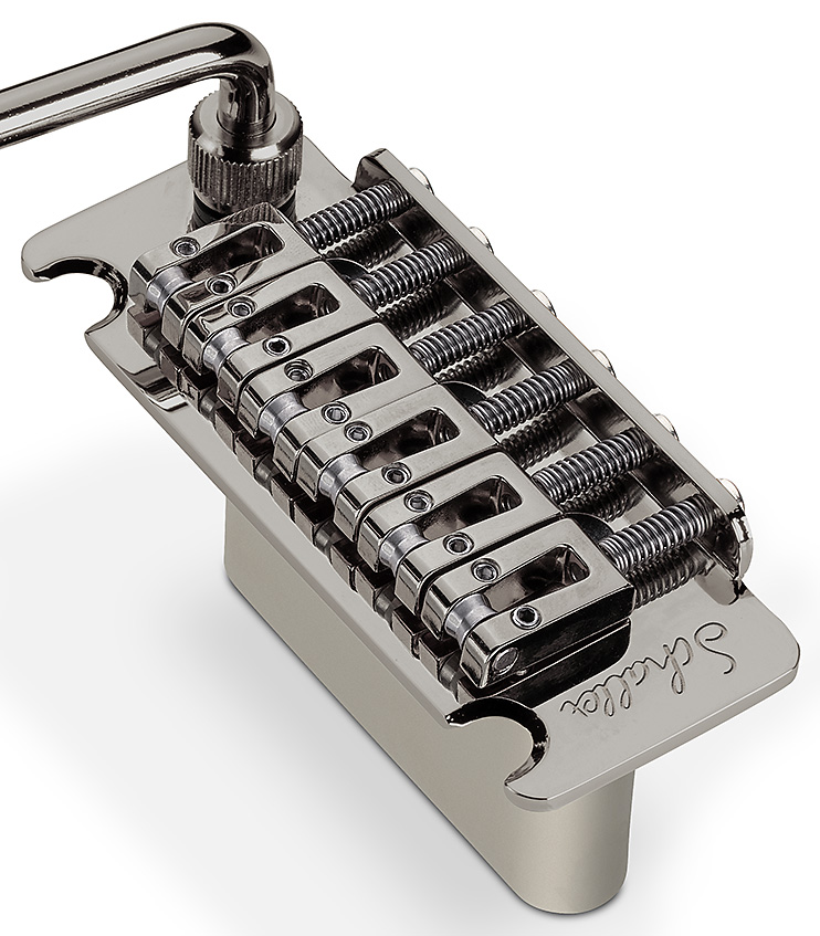 The baseplate of hardened steel and the solid spring block of the Schaller Vintage Tremolo ensures an outstanding sustain. The Roller bridge saddles fix the strings in their optimum position. It is also a perfect replacement for Fender® Stratocaster®* tremolos with standard 74.3 mm (equivalent to the distance between the height adjustment screws).