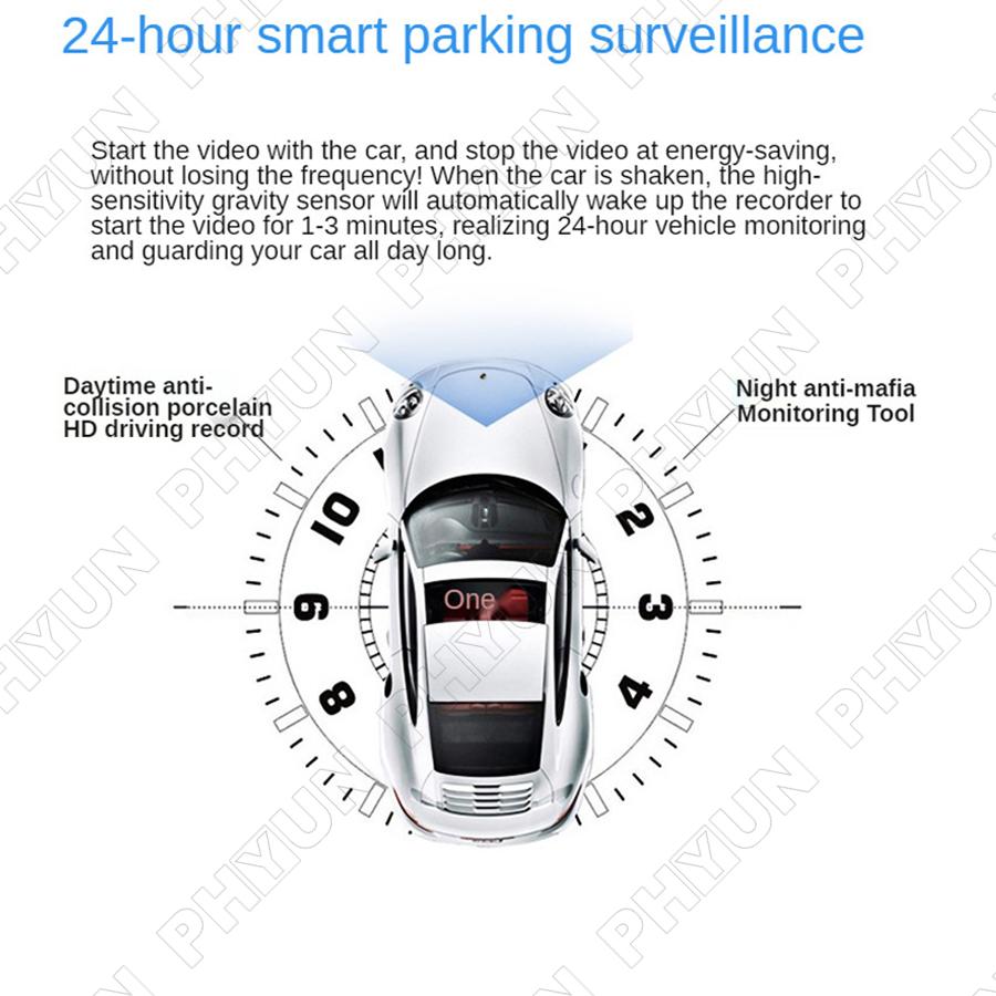 22.24-hour smart parking surveillance(Start the video with the car, and stop the video at energy-saving, without losing the frequency! When the car is shaken, the high-sensitivity. gravity sensor will automatically wake up the recorder to