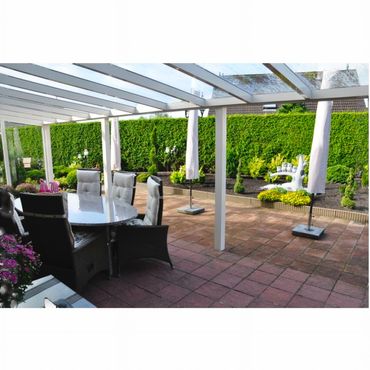 Unsere Überdachungen werden aus hochwertigem Aluminium nach deutschen Qualität-Standards hergestellt, dadurch ist die Konstruktion Ihrer Überdachung solide und Witterungsbeständig. Obendrein ist die Eigenschaft des Aluminiums sehr langlebig, farbecht und pflegeleicht. Aus Sicherheitsglas können Sie Ihre Dacheindeckung gestalten und durch verschieden extra Optionen, wie Beleuchtung, Heizstrahler, Rinnenkappen und Bodenelemente einen persönlichen Ausdruck verleihen. Neben Überdachungen in gerader Ausführung gibt es auch Möglichkeiten zwischen Überdachungen ums Eck oder freistehende Überdachungen zu wählen (hierzu bitte telef. anfragen).