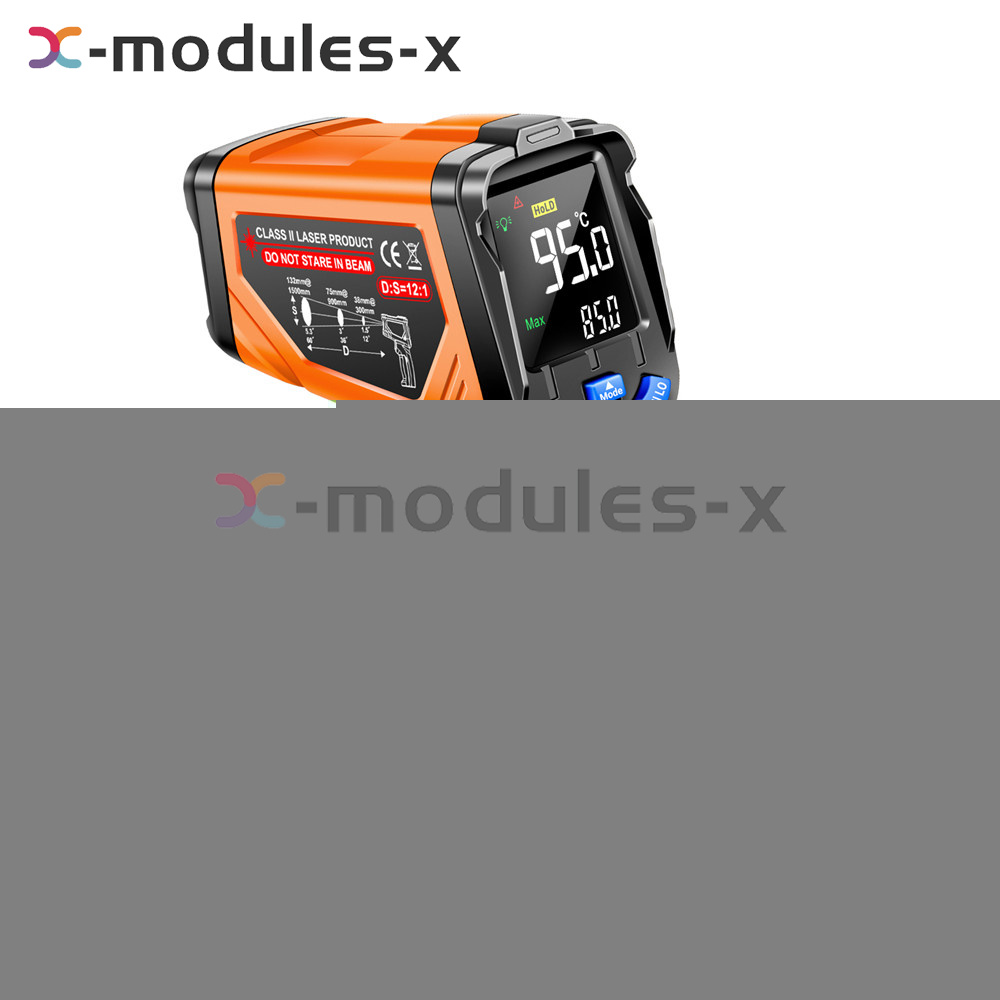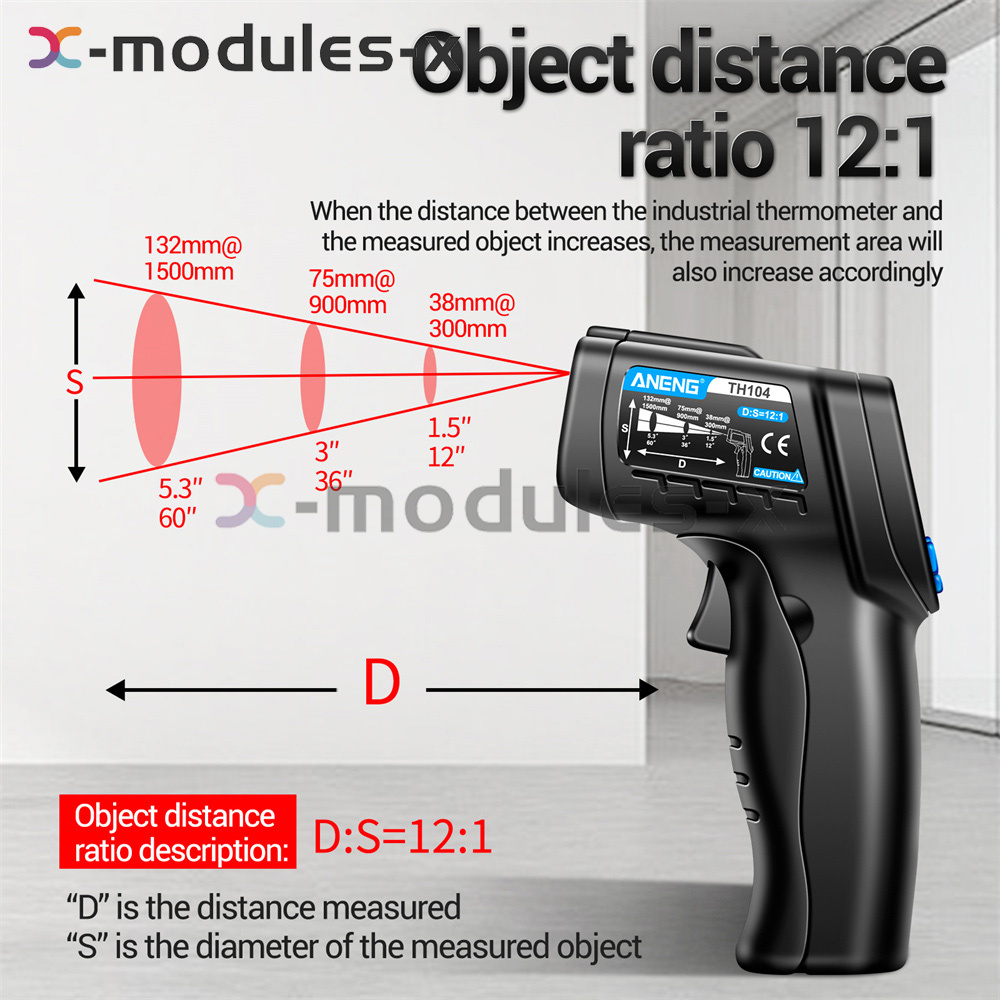 Measuring range ℃: 20℃~650℃ Measuring range ℉: 4℉~1202℉ Ambient working range:0-50℃(32-122℉) Measuring distance: D:S=12:1 Response time: 500 ms gap 94% response Emissivity: Preset 0.95 adjustable Auto Power Off: Auto power off if no operation for about 7 seconds Battery: 9V alkaline battery (shipped without battery) Screen display: VA reverse bright screen Zeroing offset: √ Average/Difference: √ Low battery alert: √ Infrared laser: √ Adjustable ℃/℉: √ Maximum and minimum values: √ HOLD Data Hold: √ High and low temperature warning: √ Backlight setting: √ Tone/Mute: √ Note: This product cannot measure human body temperature and is only for industrial use!