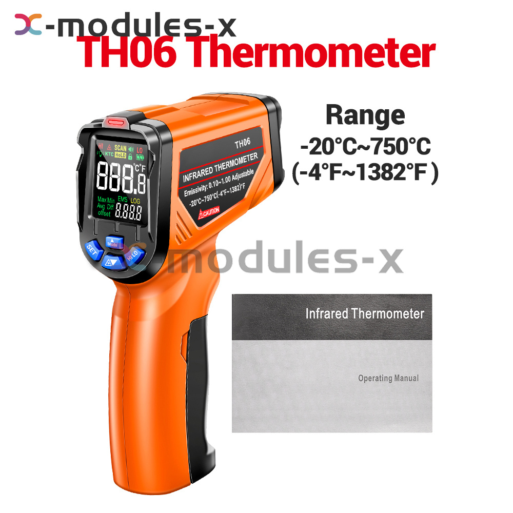 | TH06 | Model: TH06 Temperature range: -20~750℃, -4℉~1382℉ Operating altitude: 0℃~50℃ (32℉~122℉) Storage altitude: 12000m above sea level Operating Temperature: 2000m above sea level Storage temperature: -20℃~60℃ (4℉~140℉) Measuring distance: D:S=12:1 Measuring time: ≤0.5 seconds Emission rate: 0.10~1.00 adjustable Screen display: VA color inverse display Automatic shutdown: about 15 seconds without operation Battery: 9V 6F22 battery *1 (battery not included) Infrared laser: √ High/low temperature alarm: √ Low battery alert: √ ℃℉ adjustable: √ Beep switch: √ Offset zero degree offset: √ EMS emissivity adjustment: √ Avg average value: √ Diff difference measurement: √ MAX MIN Maximum and minimum values: √ Data hold: √ |