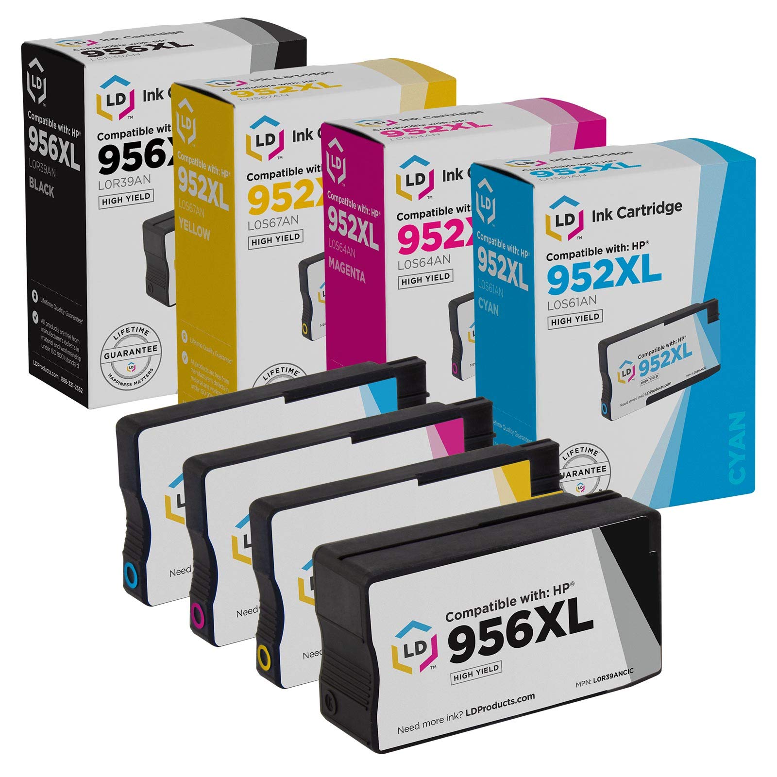 Save and print even more when you shop with LD Products! This offer includes the following compatible replacements: (1) L0R39AN (956XL) high-yield black, (1) L0S61AN (952XL) high-yield cyan, (1) L0S64AN (952XL) high-yield magenta and (1) L0S67AN (952XL) high-yield yellow ink cartridges. The HP 956XL/ L0R39AN replaces the 952XL/F6U19AN standard high-yield black ink cartridge. Why pay twice as much for brand name ink when our compatible printer supplies are manufactured to meet or exceed the same quality standards as the original (OEM) brand? Compatible with HP OfficeJet Pro: 7720, 7730, 7740, 8200, 8210, 8216, 8218, 8700, 8716, 8718, 8719, 8724, 8725, 8726, 8727, 8728, 8730, 8732M, 8734, 8735, 8736, 8740, 8743, 8744, 8745, 8746, and 8747 printers. Please note, retail packaging may vary and these cartridges will only work with printers purchased within the United States and Canada. The use of compatible printing supplies does not void your printers warranty. Professionally manufactured by LD Products. HP is a registered trademark of HP Inc. and is not affiliated with and does not endorse LD Products. |