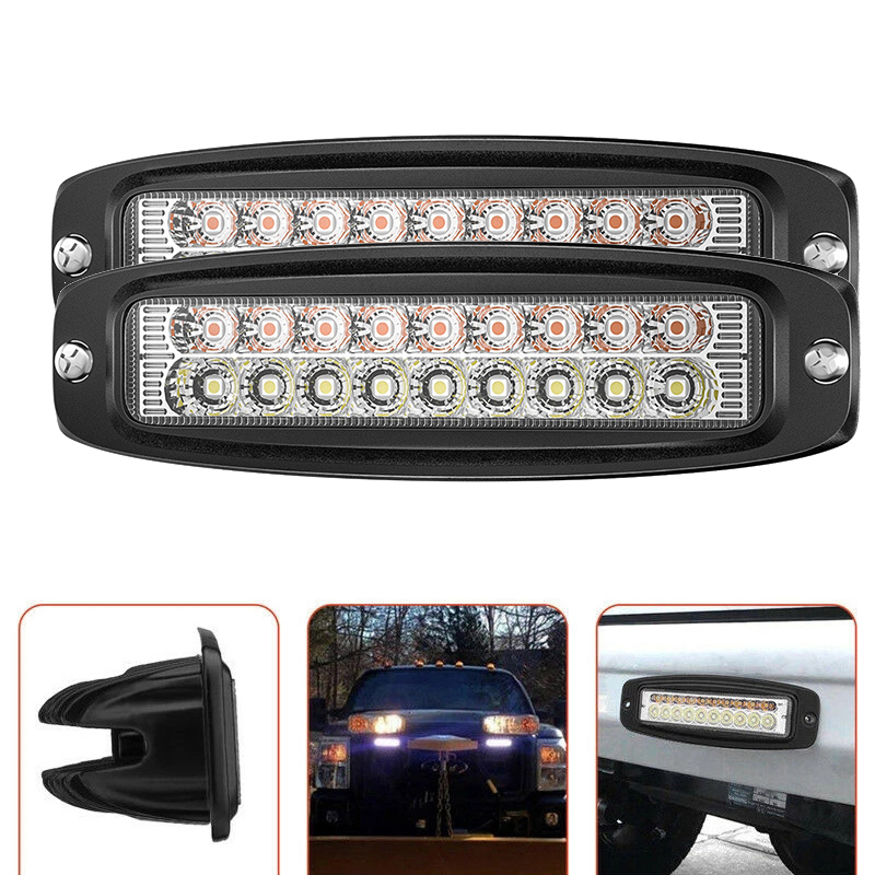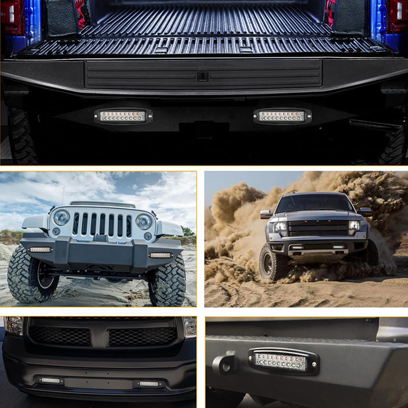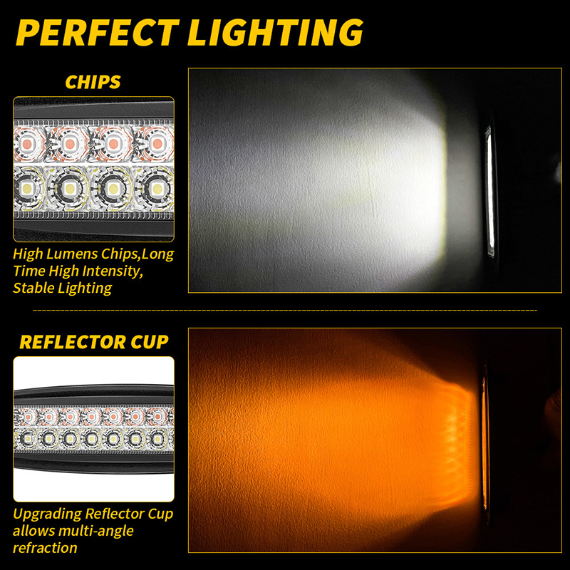7 INCH LED POD LAMP: It is powered by 72W to delivers super bright 1400 lumens. Each slim LED pod light bar features two-row dual color switchback. 9 pieces LED chips for 6000k white light as driving, reverse or fog lights and other 9 pieces LED chips for 3000k amber yellow as front or rear turn signal lights. Optical reflector cup provides with high intensity spot beam for farther and more focused vision.