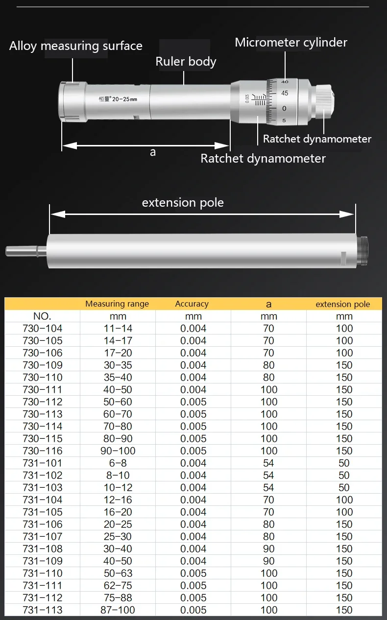The technical difficulty of the three-jaw inner diameter micrometer lies in the gap between the measuring jaws. The larger the gap between the measuring jaws, the greater the measurement error.