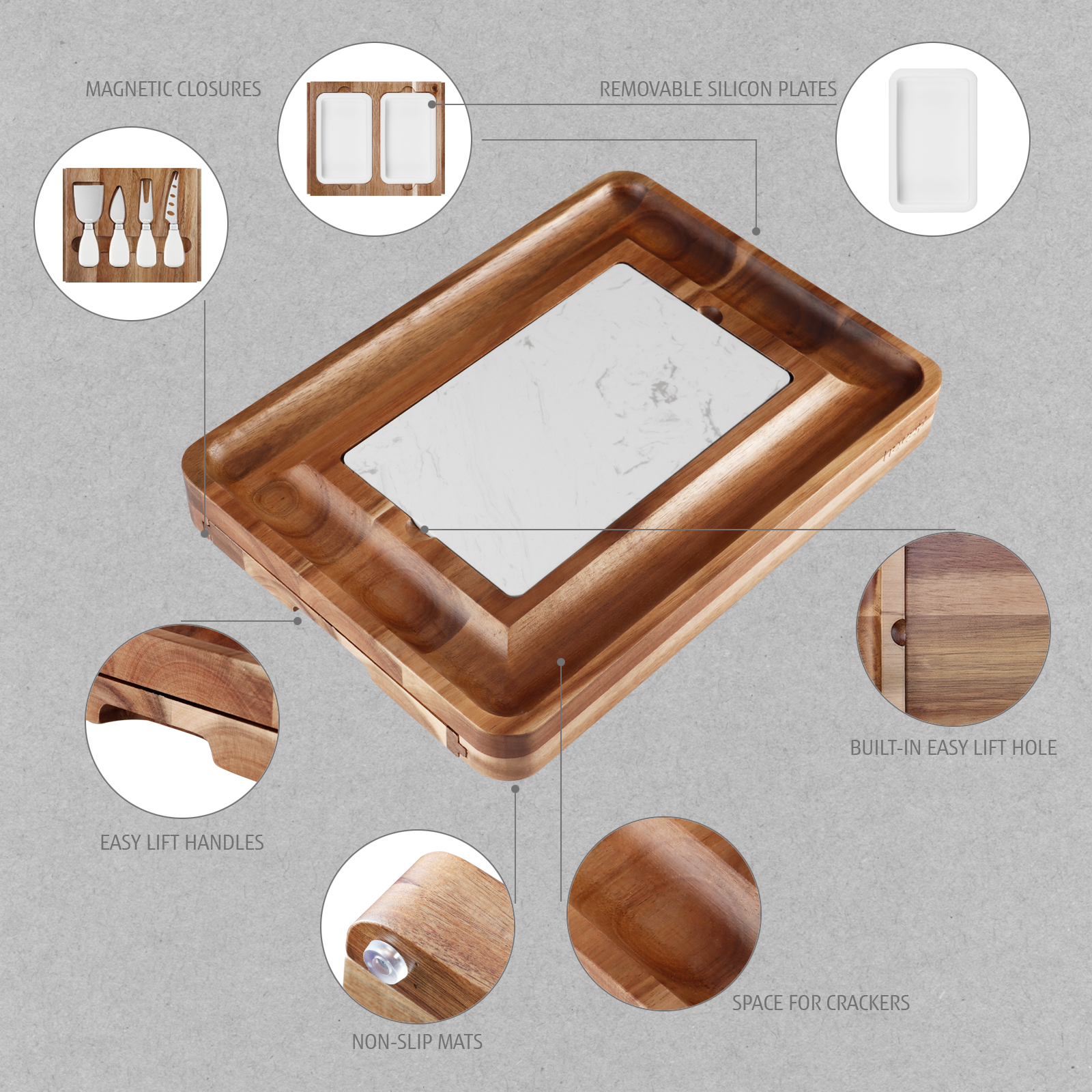 - 237mm x 142 mm Marble Board ( 2 sides, the marble board is surrounded by a deep and smooth cracker storage area, which is very easy to get and clean );