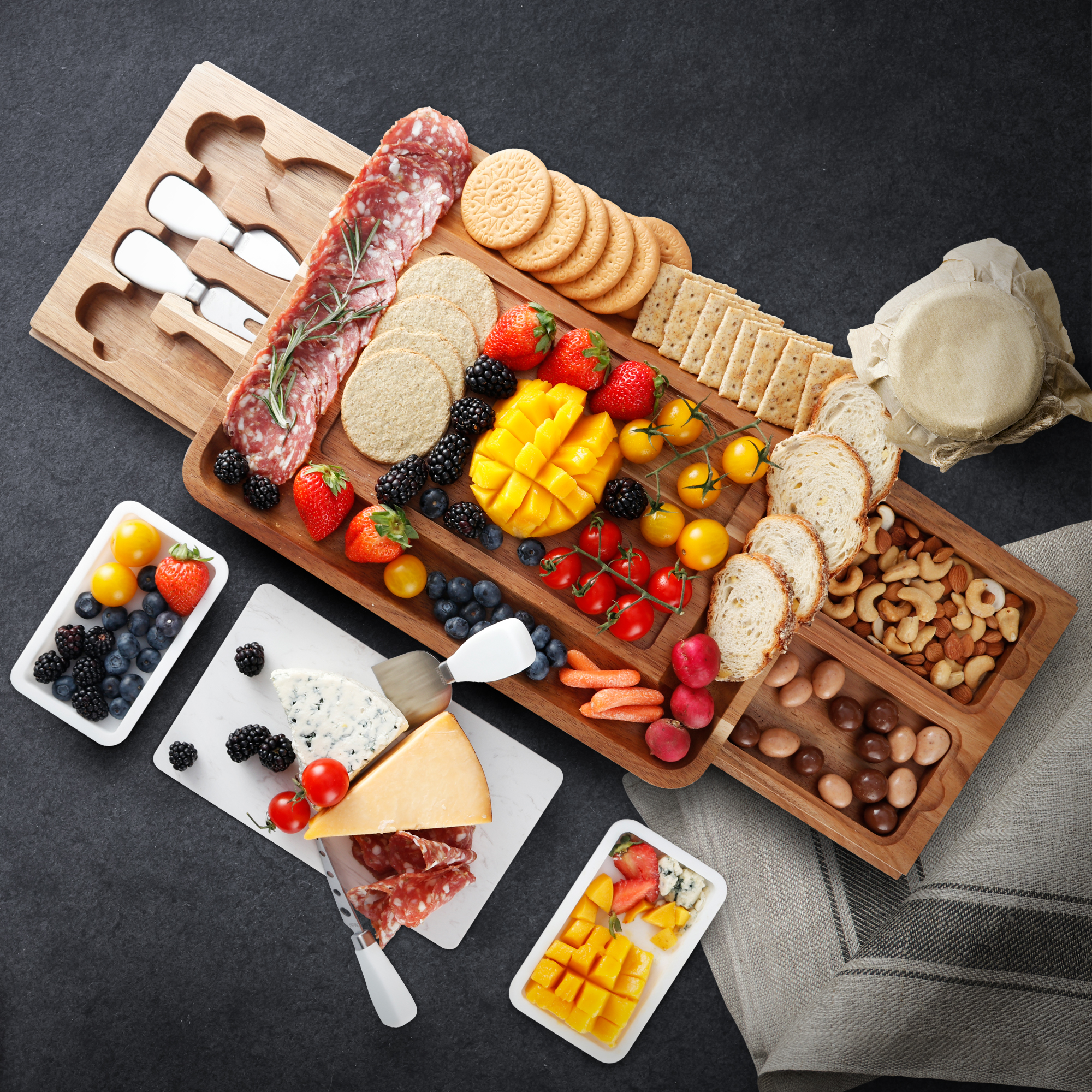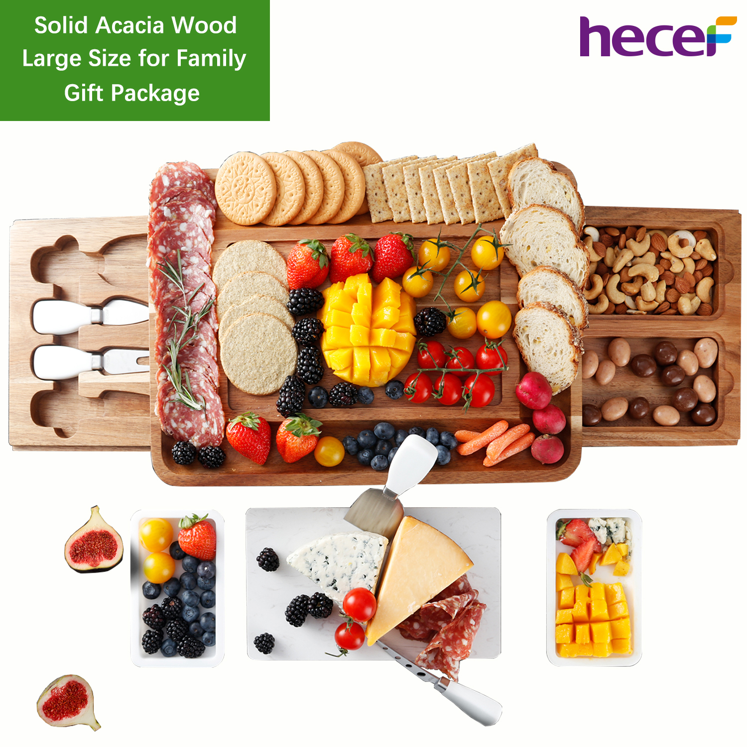 - An acacia wood cheese board with hidden side out drawer with 2 Magnets for firm grip.