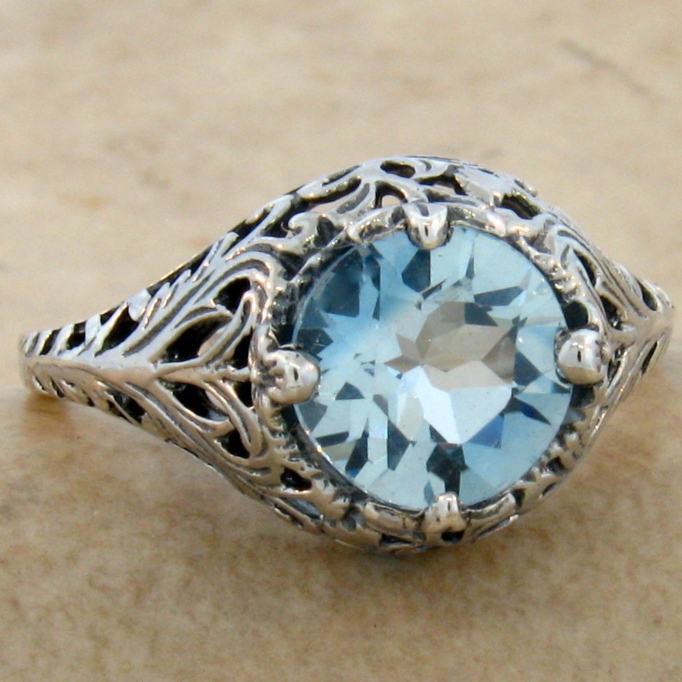 Antique Style Genuine Sky Blue Topaz .925 Solid Sterling Silver Filigree Style Ring. The Top Of The Ring Measures Just Over 3/8 Inches, 11.5mm In Length. This Spectacular Antique Style Reproduction Is Set With One Genuine 8mm Round Faceted, 2.00 Carat Sky BlueTopaz Stone. Inspired By The Original Designs Of The Victorian To The Art Deco Period, 1836-1935. Item Is Stamped 925. Our Silver Is Genuine 925 Sterling Silver. Specializing in Antique and Vintage Designs