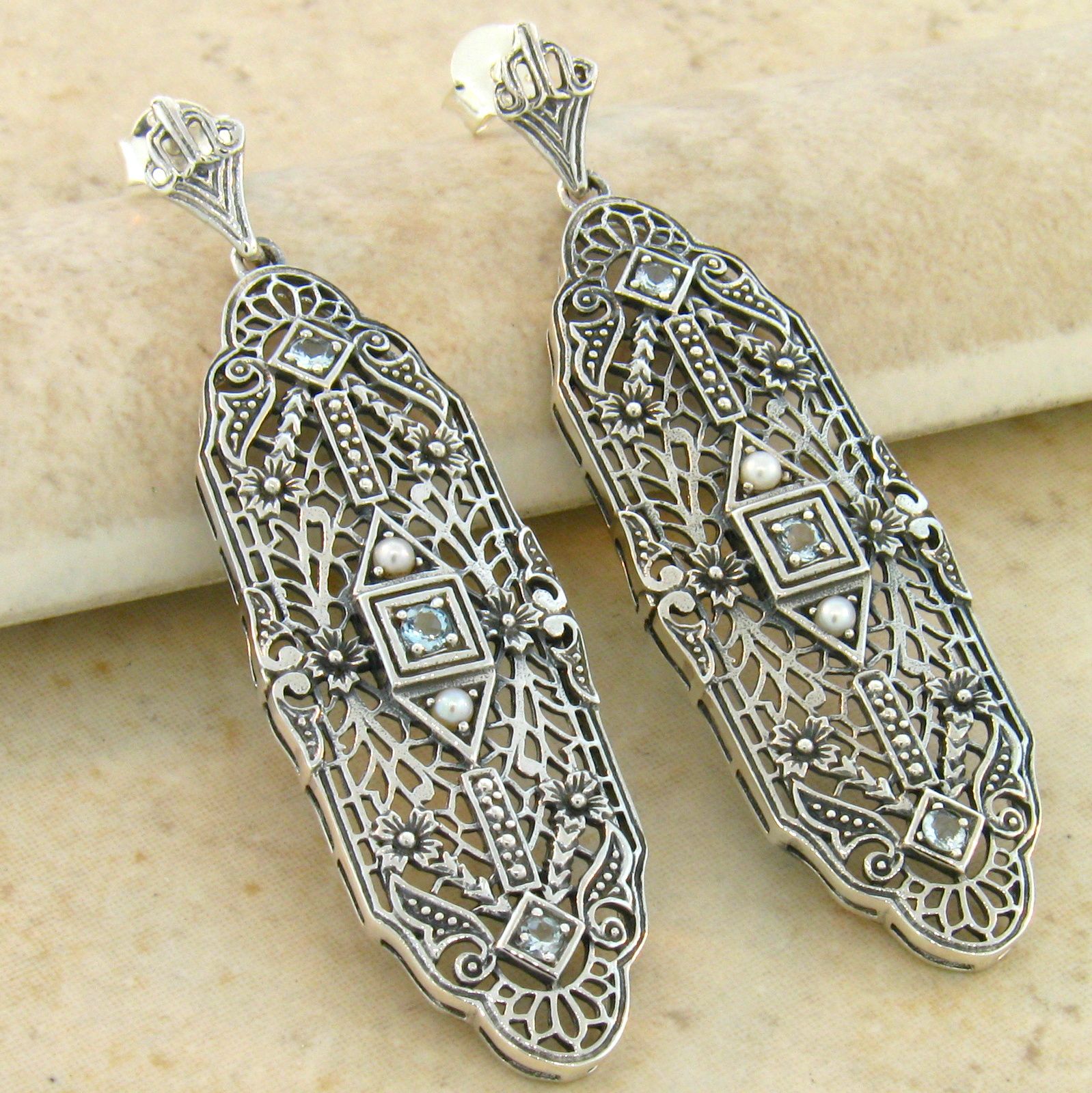 Genuine Aquamarine & Pearl .925 Solid Sterling Silver Edwardian To Art Deco Style Filigree Earrings. The Earrings Measure 2 Inches In Total Length. This Classic Pair Of Edwardian Period Antique Reproduction Earrings Are Set With Genuine Aquamarine Stones & Have Freshwater Pearl Accents. Inspired By The Original Designs Of The Victorian To The Art Deco Period, 1836-1935. Item Is Stamped 925. Our Silver Is Genuine 925 Sterling Silver. Vintage Design