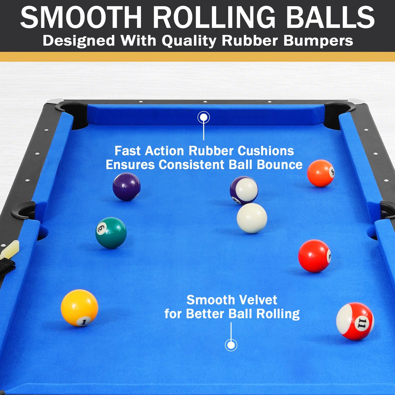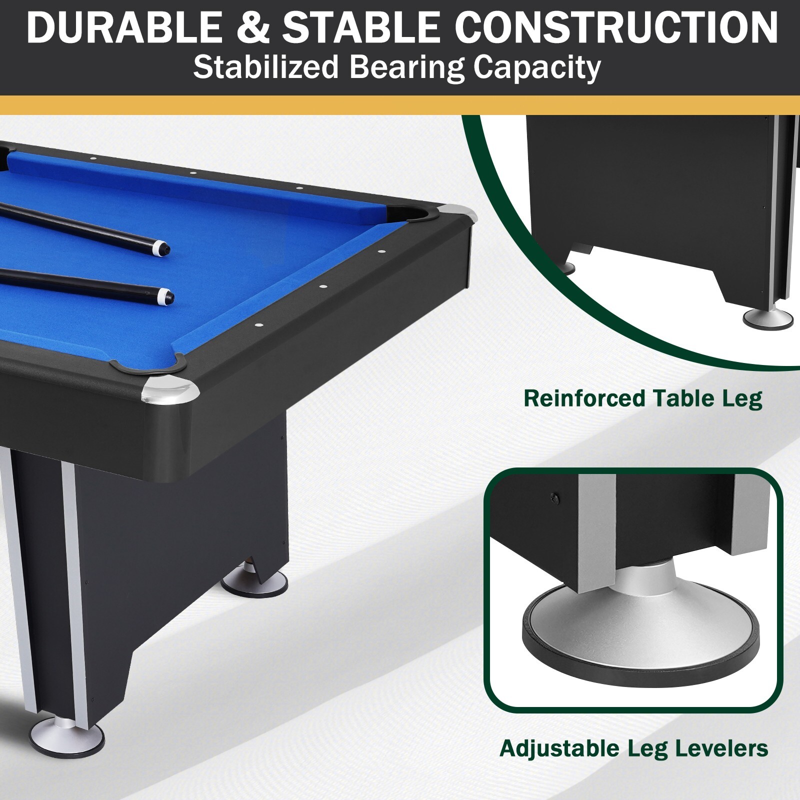 Heavy-duty, mid-size pool table measures 7ft x 3.8ft x 2.6 ft; Full set includes 7 ft table, 2 (57.6 in.) cue sticks, 15 regulation pool balls and cue ball, ball rack, felt brush and chalks.