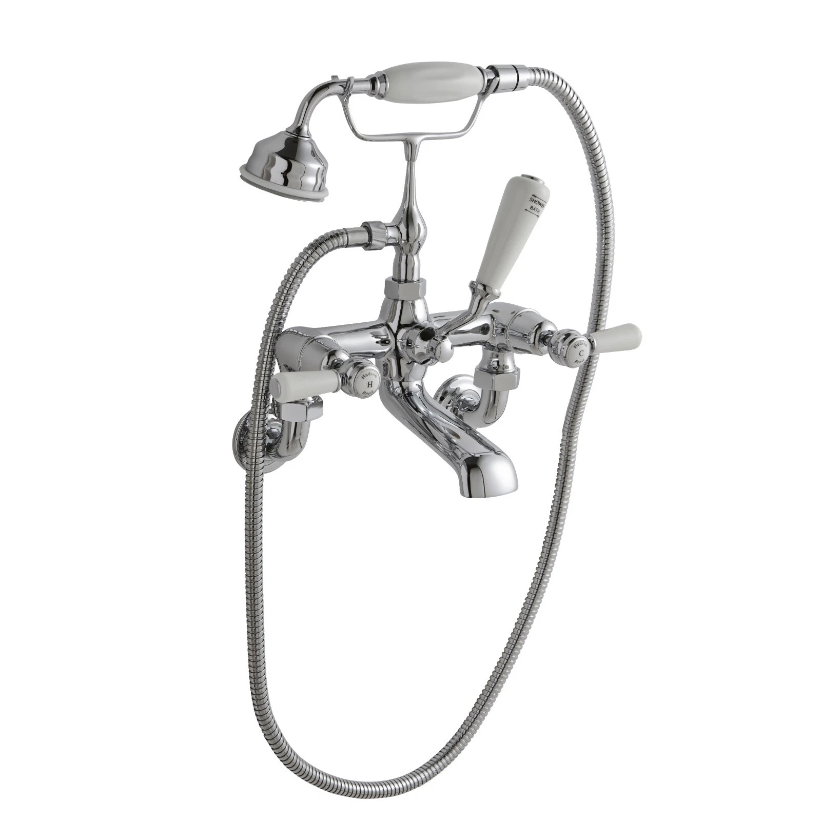 Introducing the Hudson Reed White Topaz Wall Mounted Bath Shower Mixer Tap with Lever Handle. This traditional style tap is suitable for use in the bath and features a 1/4 turn ceramic disc valve/cartridge type with a manual temperature control. The tap comes with a tap, handheld shower, shower hose, fixings and a manufacturer warranty of 20 years. The sleek and polished finish of this unit is complemented by its black topaz indices, with a crank handle for easy use. The ceramic disc technology ensures quick cleaning and water conservation. This bath shower mixer tap is made of brass and chrome materials, with a pipe size of 22mm (3/4" BSP) and a pipe centre of 196mm. The item weighs 4.7kg and has a size of 155mm in length, 350mm in width and 320mm in height.
