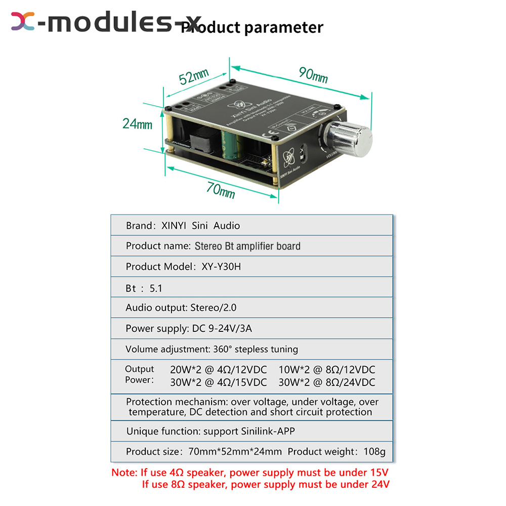 Adaptable speaker impedance 8 ohms, power supply can not exceed 24V