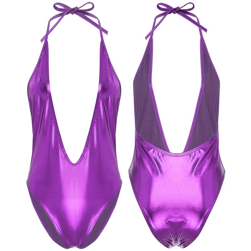 Women Shiny Metallic Halter Neck Open Back Hip Straps Bras G-string Briefs Jumpsuit Lingerie.